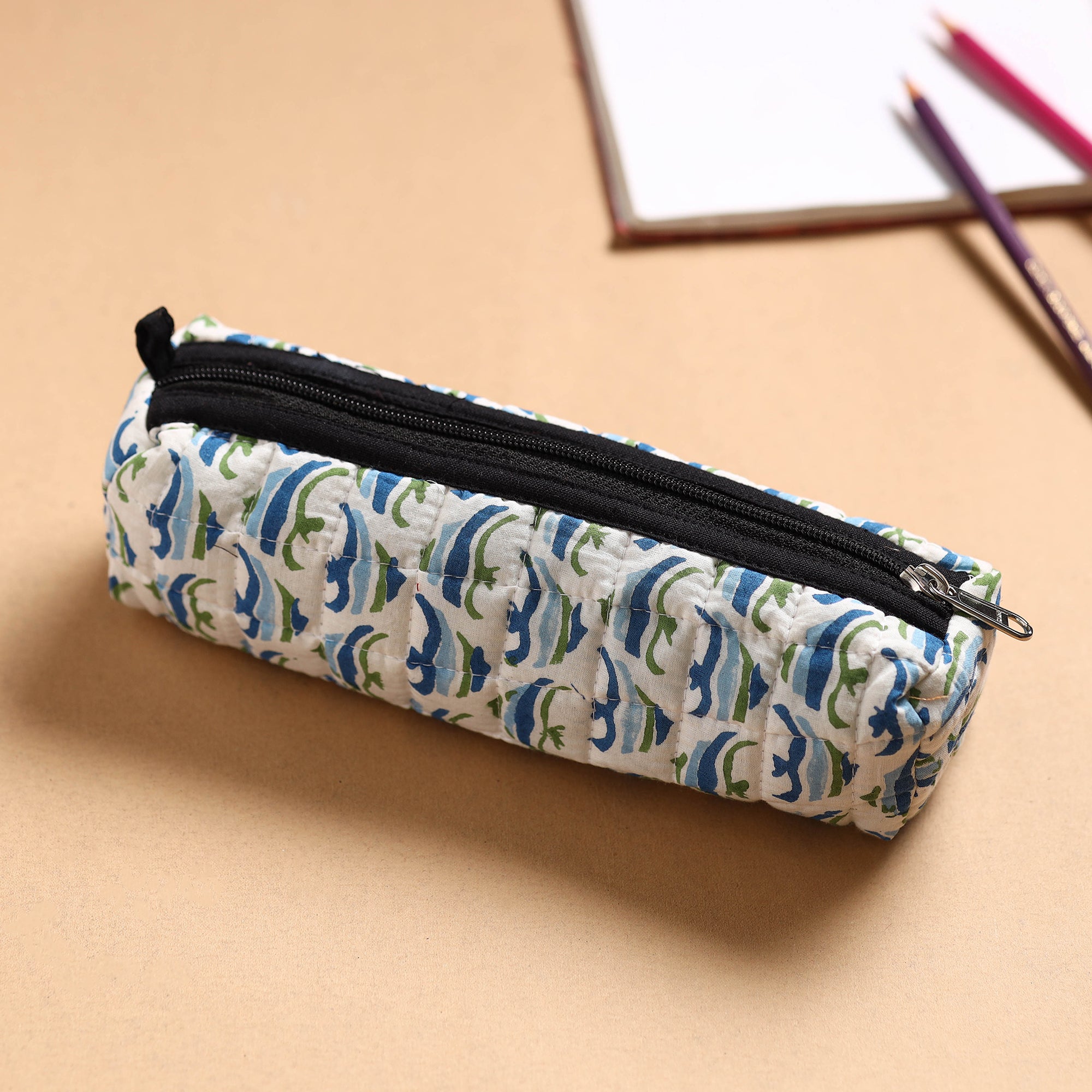 Experience the perfect blend of artistry and utility with our handcrafted quilted Jaipur Prints multipurpose pencil pouch. This pouch is made from Jaipur Printed cotton fabric with quilted filling. Safely store your pencils, pens, and other essentials in style. Perfect for students, artists, or anyone who appreciates handmade elegance and functionality in their everyday carry.