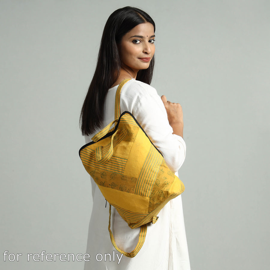 Embrace eco-friendly fashion with our yellow jugaad patchwork handmade pithu bag. This pithu bag is made from a blend of cotton fabrics. It has one zipper pocket on the backside and an inside pocket as well. It is generously sized to hold a water bottle, clutch, and other essentials like books, stationery, and more, making it the perfect choice to carry for everyday use. Embrace the charm of handmade craftsmanship while enjoying the functionality of a trendy pithu bag.