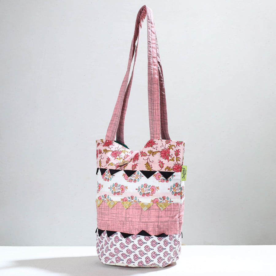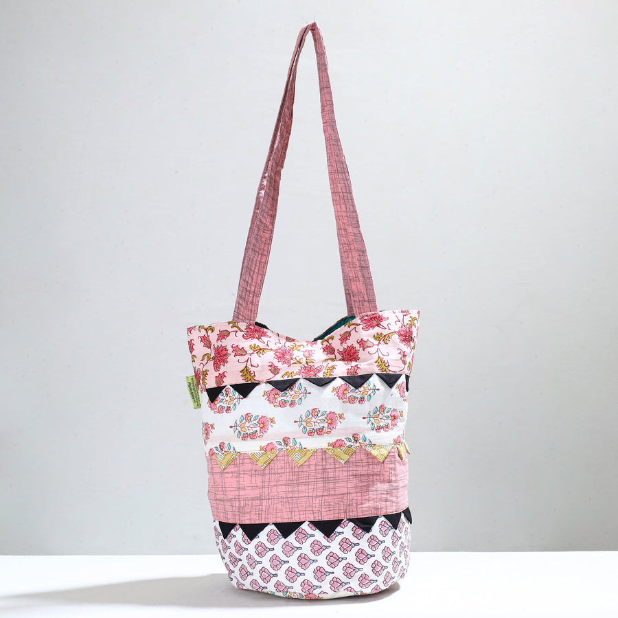 Embrace eco-friendly fashion with our pink jugaad patchwork handmade shoulder bag. A convenient, stylish, and sustainable companion for your daily shopping. This shoulder bag is made from a blend of cotton fabrics. It has one pocket. And it has enough space to accommodate most of the items. Embrace the charm of handmade craftsmanship while enjoying the functionality of a trendy shoulder bag.