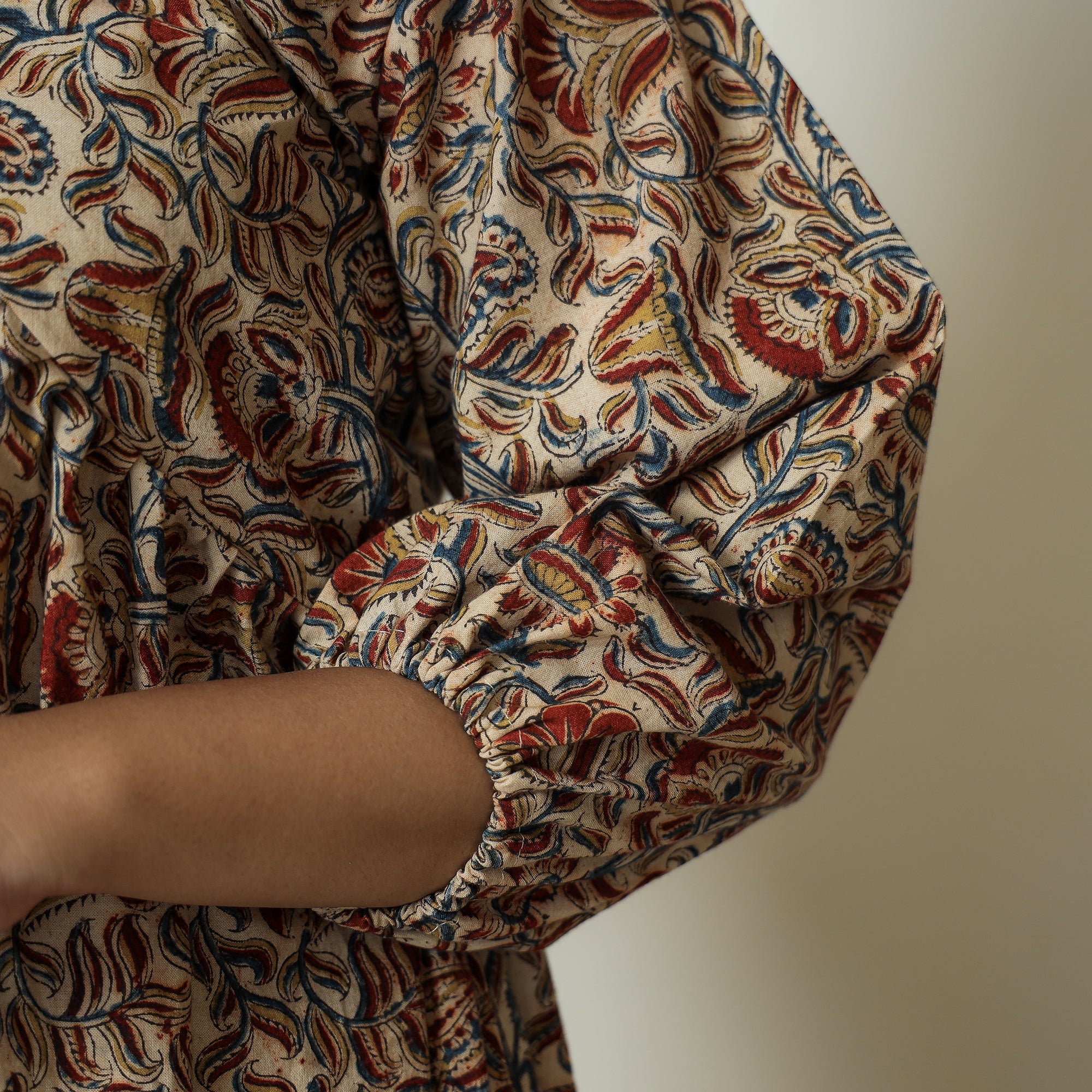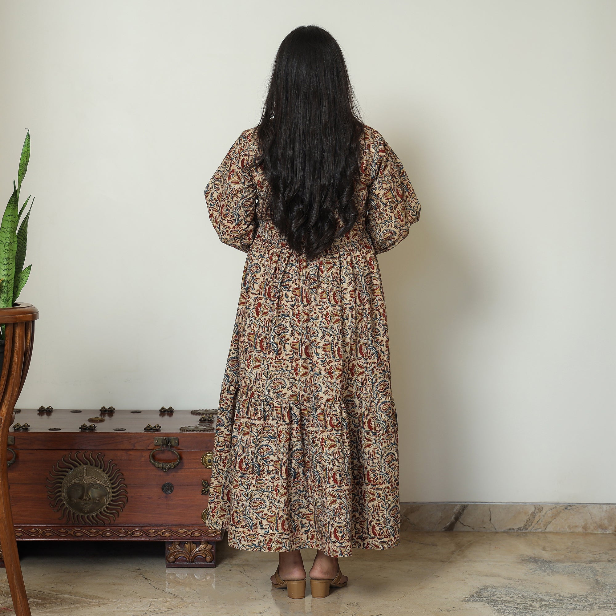 Indulge in the traditional charm of this pedana kalamkari block-printed cotton gher dress, thoughtfully designed to enhance your style. This dress is crafted from cotton fabric, ensuring a comfortable feel against your skin. This cotton dress makes you comfortable all day long. Embrace tradition with modern flair in this must-have attire, perfect for daily wear and special occasions alike.