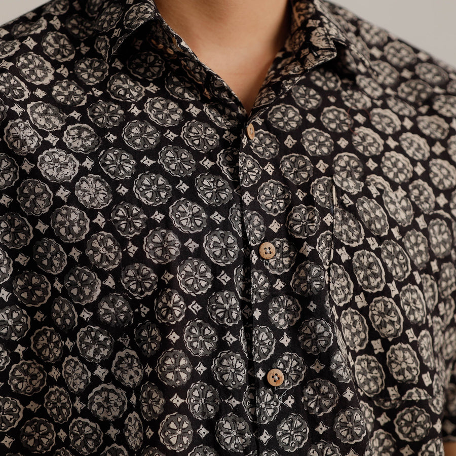 This bagru block-printed cotton men's half-sleeve shirt is the perfect blend of style and comfort. This shirt is carefully cotton fabric, which ensures all-day comfort. The crisp wooden buttons add a touch of natural charm, while the patch pocket on the front offers convenience and practicality. Perfect for both casual outings and semi-formal occasions, this shirt effortlessly blends cultural charm with contemporary fashion.