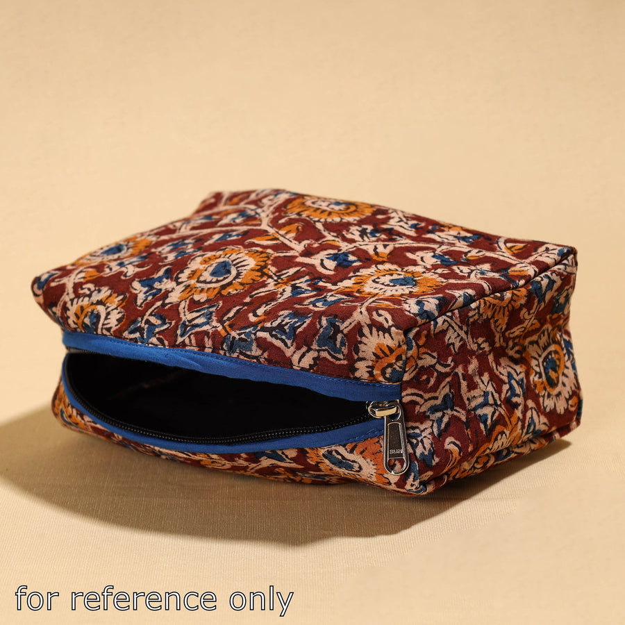 This versatile cosmetic/toiletry pouch is crafted from ajrakh block-printed cotton fabric, showcasing a blend of style and functionality. With a PVC (polyvinyl chloride) waterproof sheet layer inside. It's perfect for organizing toiletries, cosmetics, or travel essentials. It ensures your belongings stay secure and stylish, whether at home or on the go.