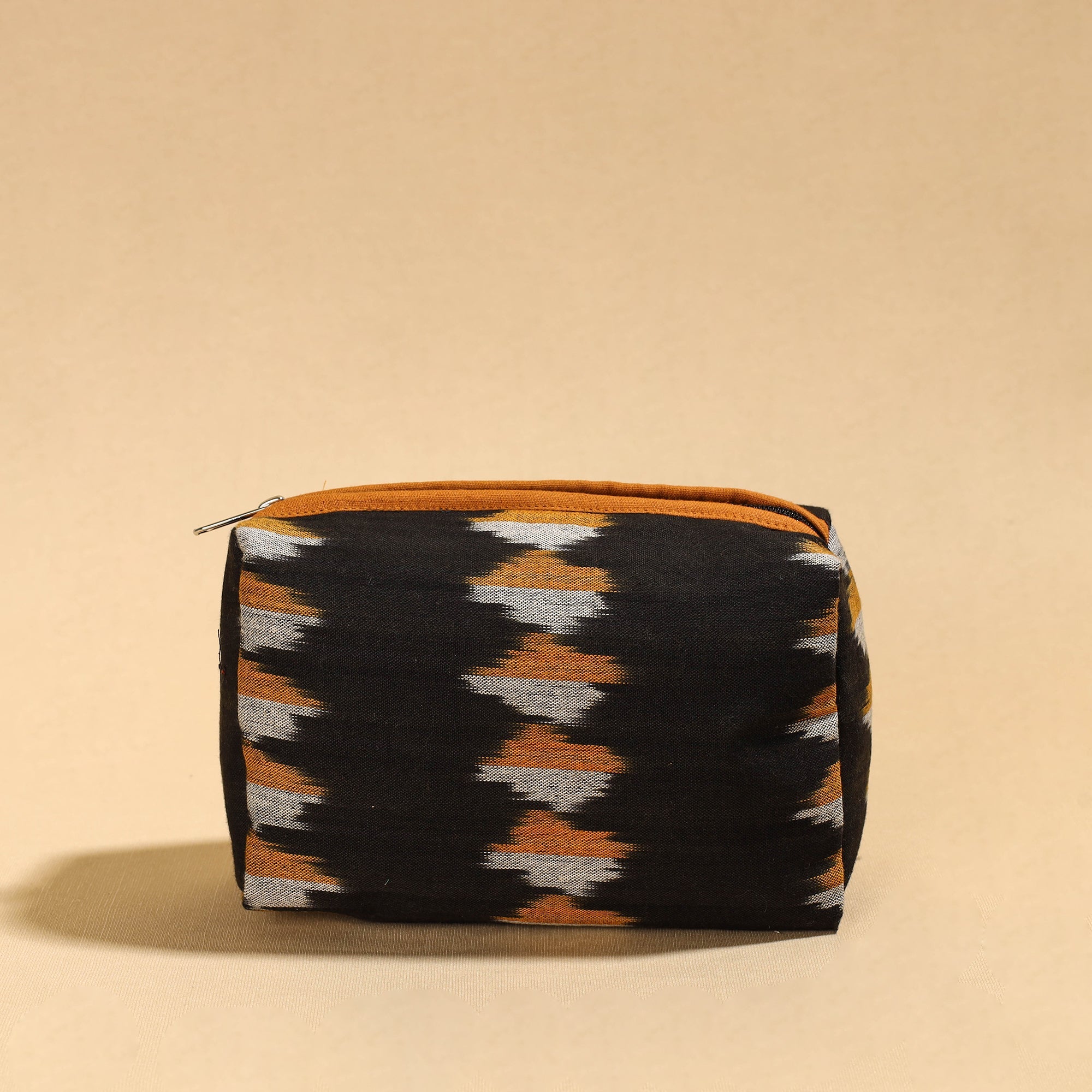 This versatile cosmetic/toiletry pouch is crafted from pochampally ikat cotton fabric, showcasing a blend of style and functionality. With a PVC (polyvinyl chloride) waterproof sheet layer inside. It's perfect for organizing toiletries, cosmetics, or travel essentials. It ensures your belongings stay secure and stylish, whether at home or on the go.