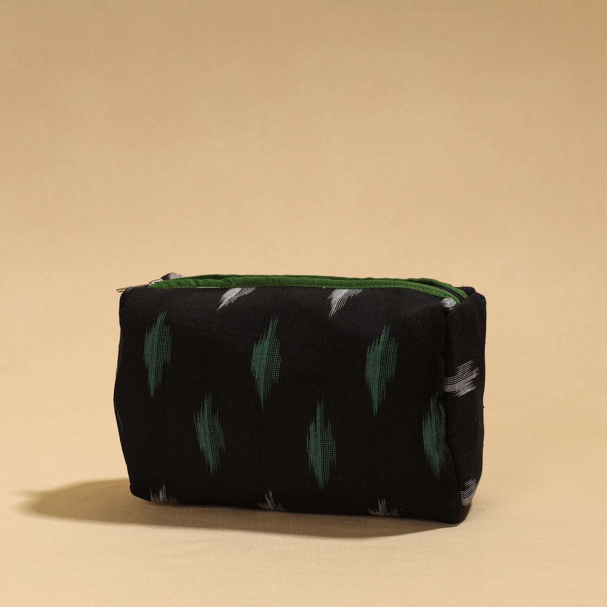 This versatile cosmetic/toiletry pouch is crafted from pochampally ikat cotton fabric, showcasing a blend of style and functionality. With a PVC (polyvinyl chloride) waterproof sheet layer inside. It's perfect for organizing toiletries, cosmetics, or travel essentials. It ensures your belongings stay secure and stylish, whether at home or on the go.
