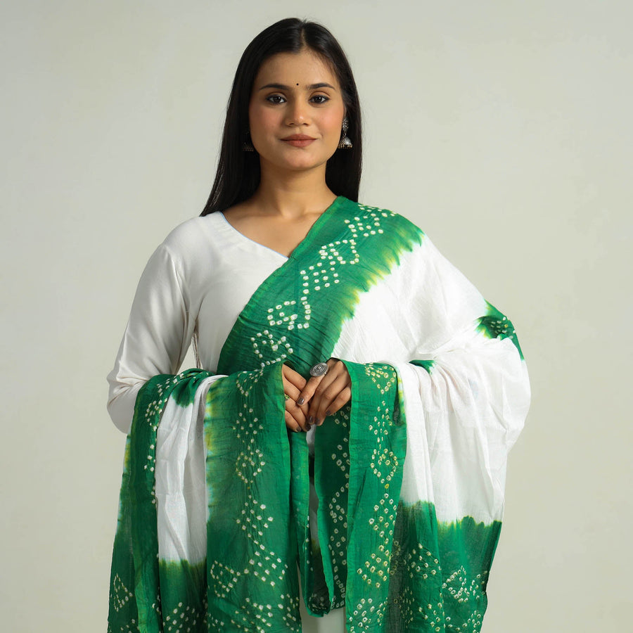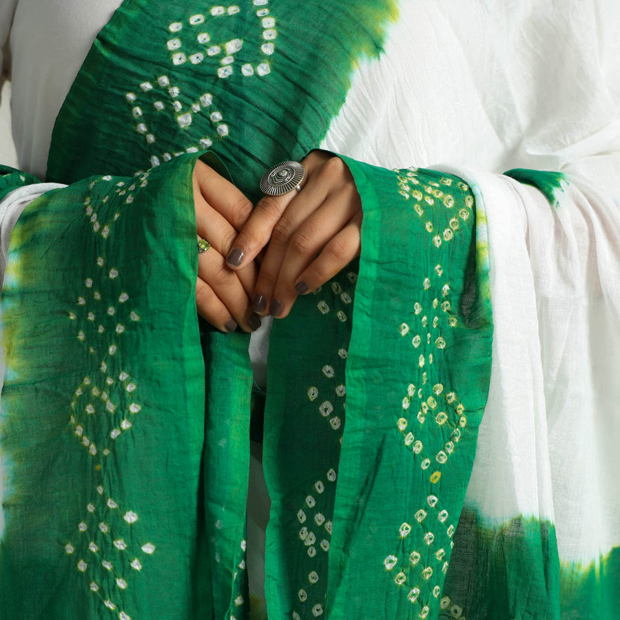 This fine-quality bandhani tie-dye cotton dupatta is skillfully crafted by the artisans of kutch using the traditional bandhani tie-dye technique. The dupatta features a majestic bandhani pattern, created by tying the fabric with thread at several points before dyeing it. The result is a beautiful, intricate pattern that is unique to each piece. The cotton fabric is lightweight and breathable, making it a perfect addition to any wardrobe for any occasion.