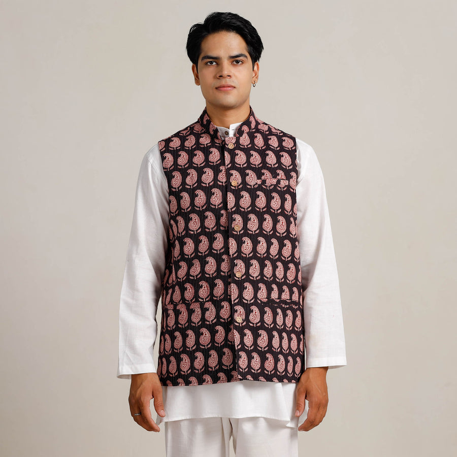 Elevate your style with our kantha style black bagh print nehru jacket, a true representation of Indian craftsmanship. Made from high-quality bagh block-printed cotton, this sleeveless jacket features a stylish chinese collar and a full-button placket. The thoughtful design includes three outer pockets for added functionality. Providing comfort and a distinctive, elegant look. Perfect for both casual outings and special occasions.