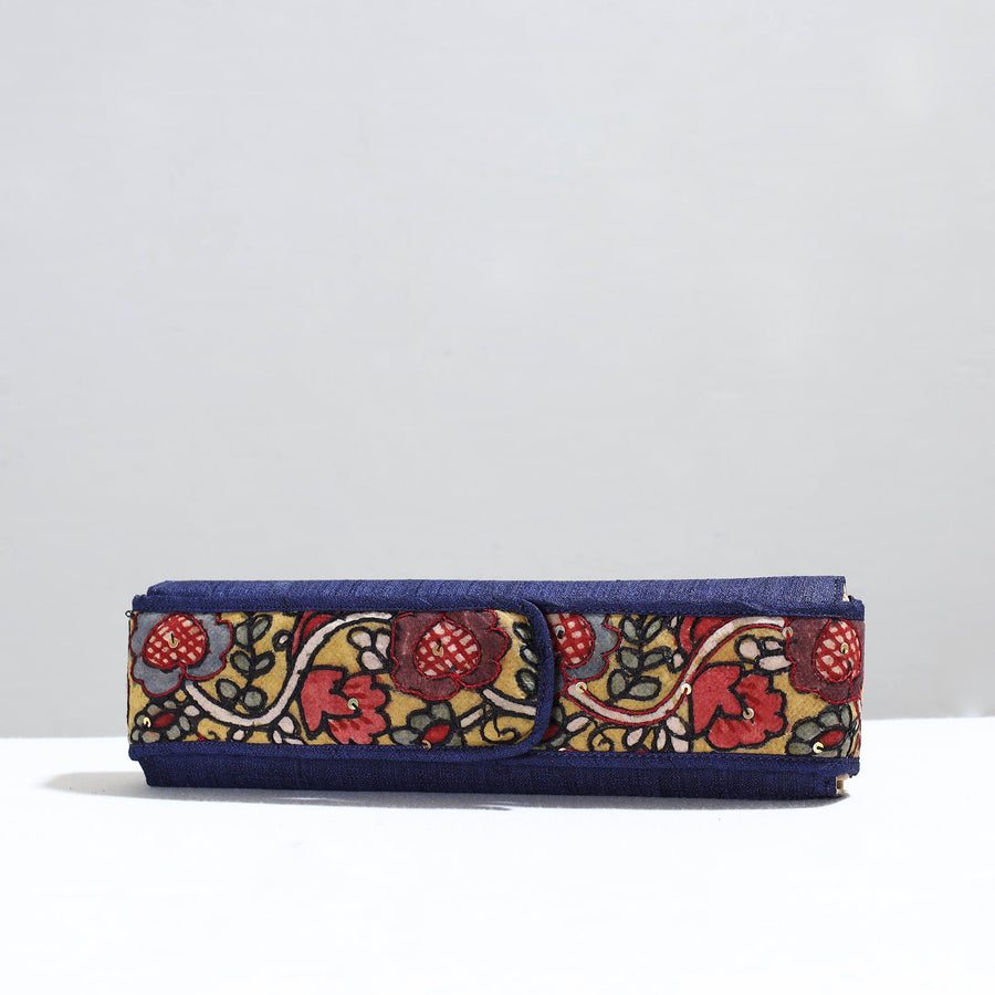 | Material | Blue handpainted "Bamboo Kalam’s" kalamkari natural dyed ghicha silk earrings pouch, adorned with delicate sequin work. It has six earring holders inside. This exquisite earring pouch is created with hand-painted kalamkari work, where the "kalam" or pen is used for free-hand drawing of the subject and filling in the colors. Safeguard your precious earrings with style and grace, while adding a touch of traditional elegance to your accessory collection. |