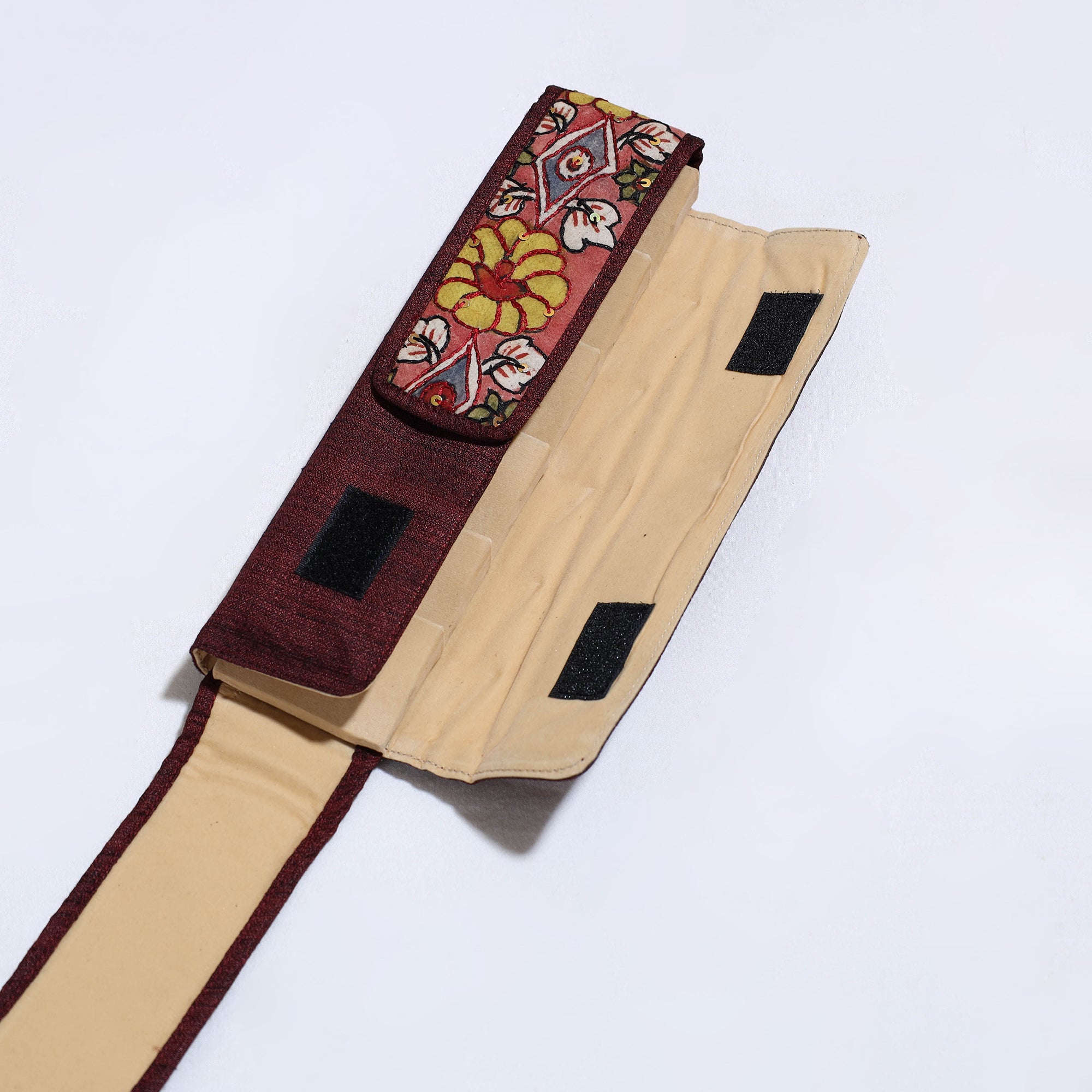 | Material | Brown handpainted "Bamboo Kalam’s" kalamkari natural dyed ghicha silk earrings pouch, adorned with delicate sequin work. It has six earring holders inside. This exquisite earring pouch is created with hand-painted kalamkari work, where the "kalam" or pen is used for free-hand drawing of the subject and filling in the colors. Safeguard your precious earrings with style and grace, while adding a touch of traditional elegance to your accessory collection. |