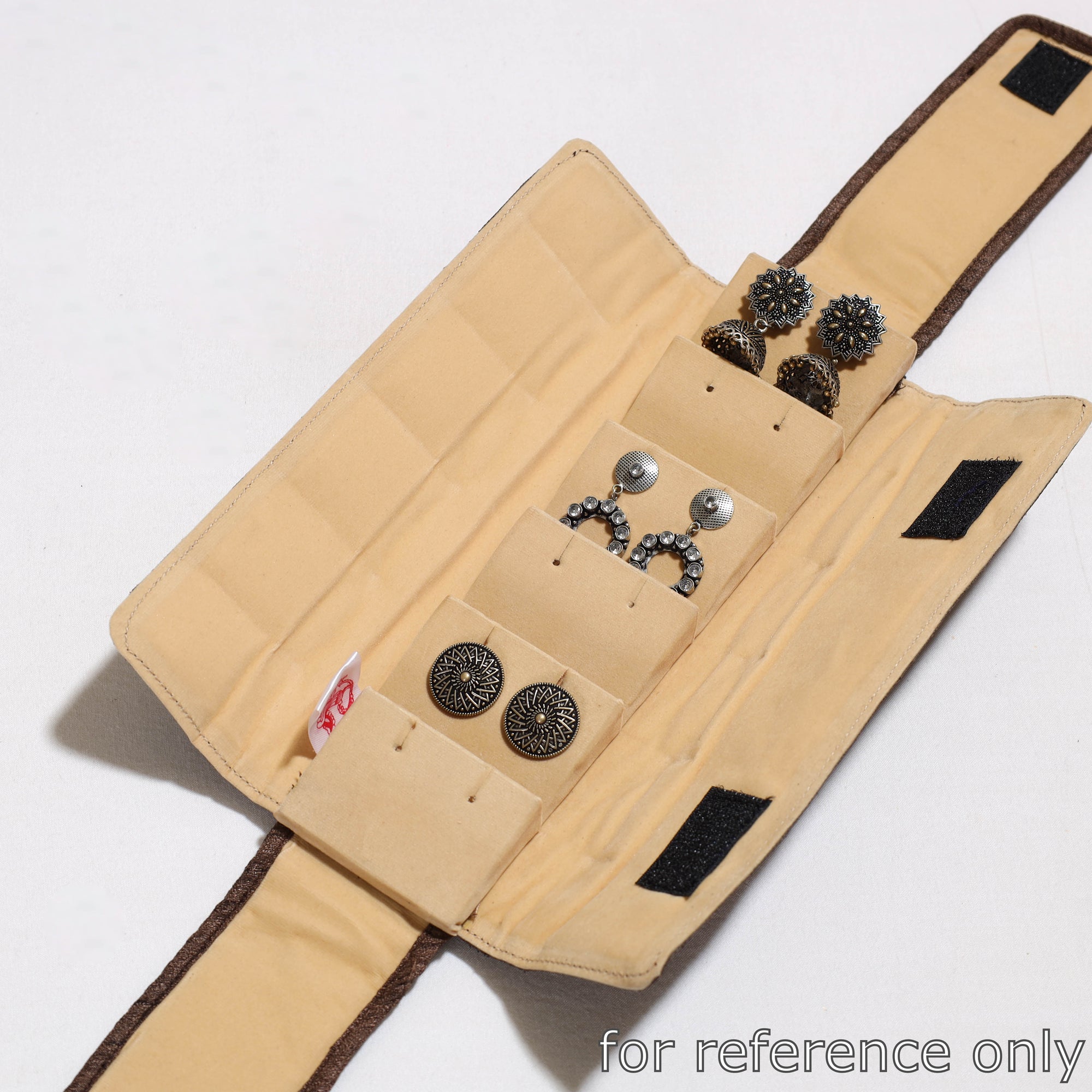 Material Black handpainted "Bamboo Kalam’s" kalamkari natural dyed ghicha silk earrings pouch, adorned with delicate sequin work. It has six earring holders inside. This exquisite earring pouch is created with hand-painted kalamkari work, where the "kalam" or pen is used for free-hand drawing of the subject and filling in the colors. Safeguard your precious earrings with style and grace, while adding a touch of traditional elegance to your accessory collection.