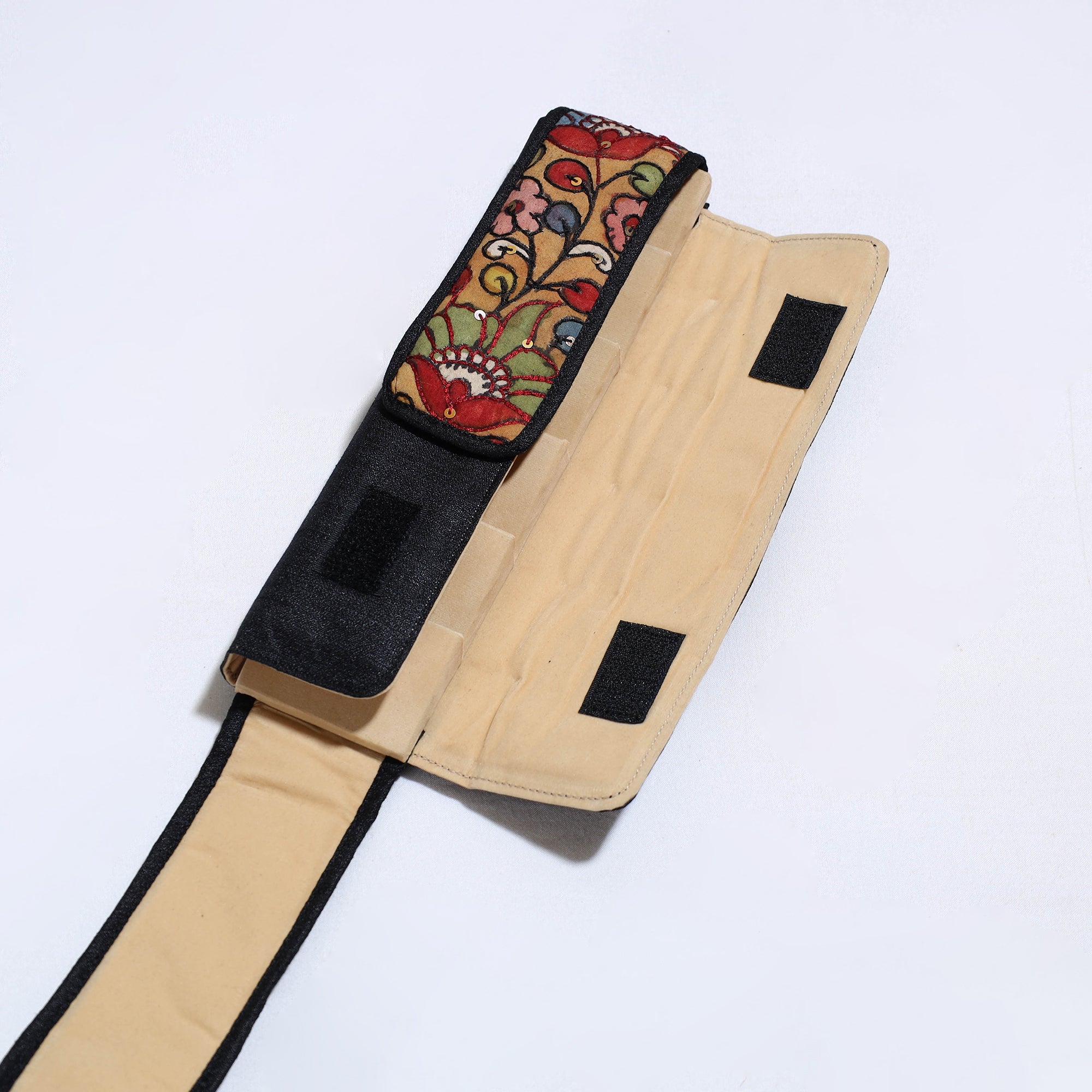 | Material | Black handpainted "Bamboo Kalam’s" kalamkari natural dyed ghicha silk earrings pouch, adorned with delicate sequin work. It has six earring holders inside. This exquisite earring pouch is created with hand-painted kalamkari work, where the "kalam" or pen is used for free-hand drawing of the subject and filling in the colors. Safeguard your precious earrings with style and grace, while adding a touch of traditional elegance to your accessory collection. |
