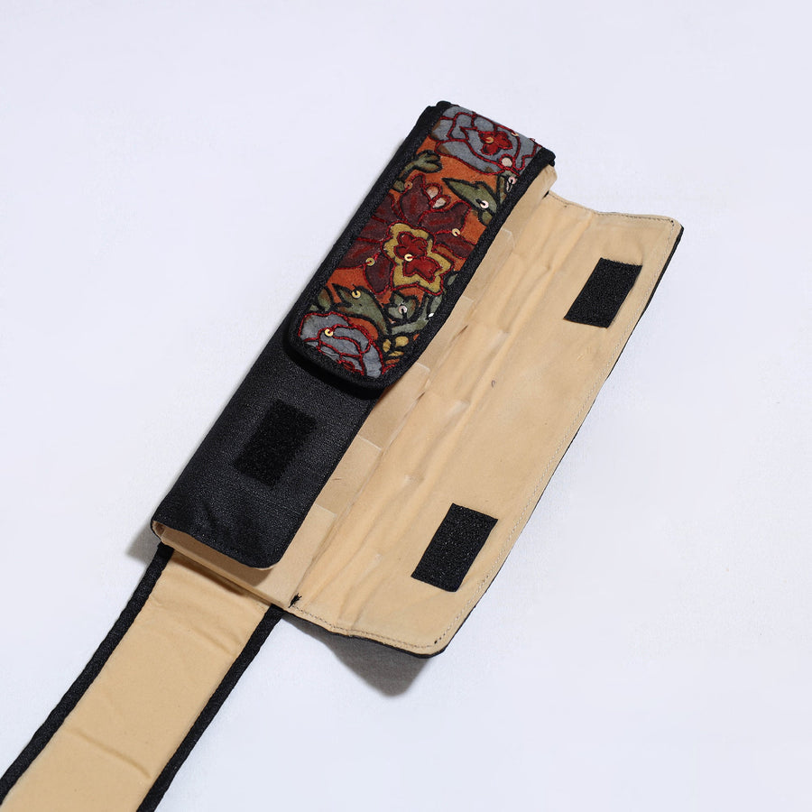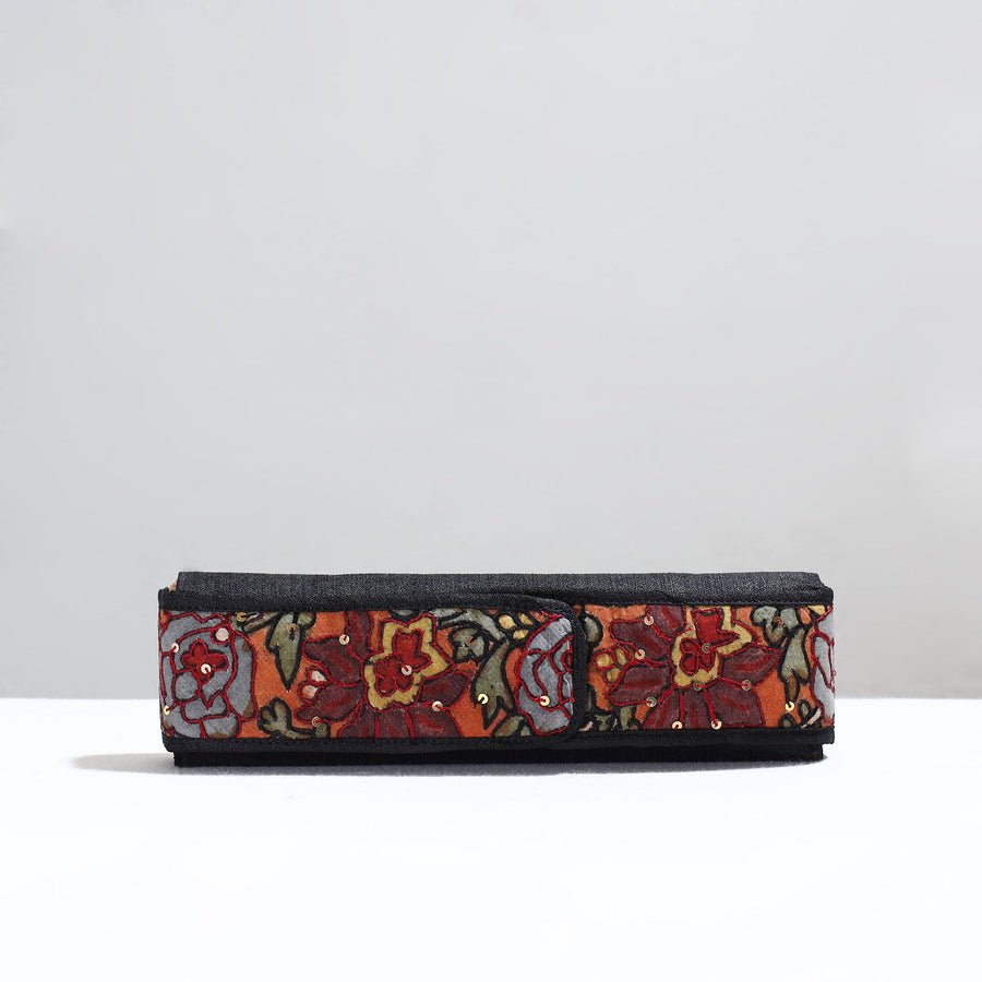 | Material | Black handpainted "Bamboo Kalam’s" kalamkari natural dyed ghicha silk earrings pouch, adorned with delicate sequin work. It has six earring holders inside. This exquisite earring pouch is created with hand-painted kalamkari work, where the "kalam" or pen is used for free-hand drawing of the subject and filling in the colors. Safeguard your precious earrings with style and grace, while adding a touch of traditional elegance to your accessory collection. |