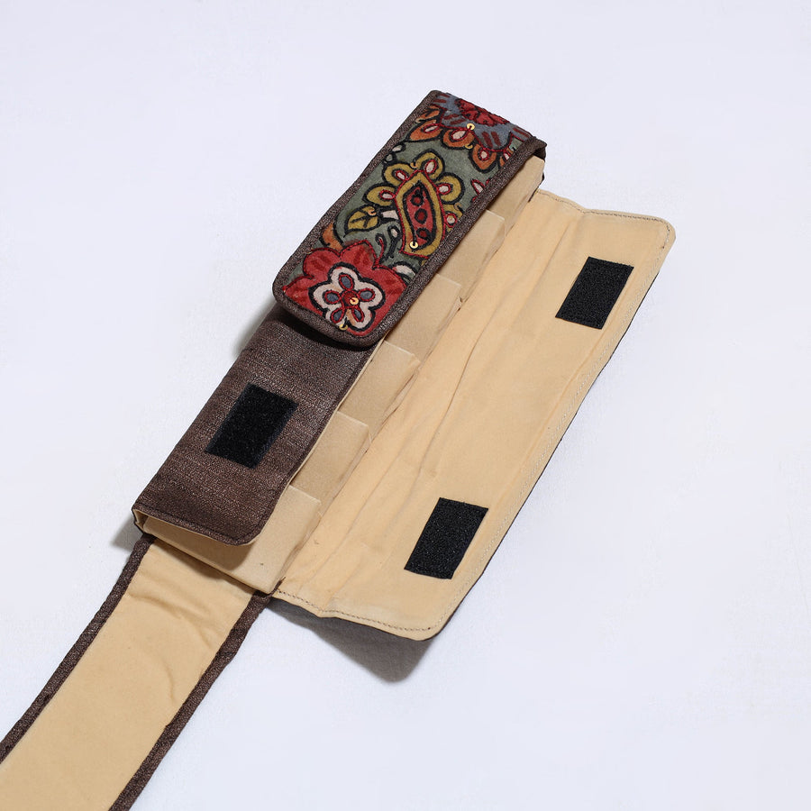 | Material | Brown handpainted "Bamboo Kalam’s" kalamkari natural dyed ghicha silk earrings pouch, adorned with delicate sequin work. It has six earring holders inside. This exquisite earring pouch is created with hand-painted kalamkari work, where the "kalam" or pen is used for free-hand drawing of the subject and filling in the colors. Safeguard your precious earrings with style and grace, while adding a touch of traditional elegance to your accessory collection. |