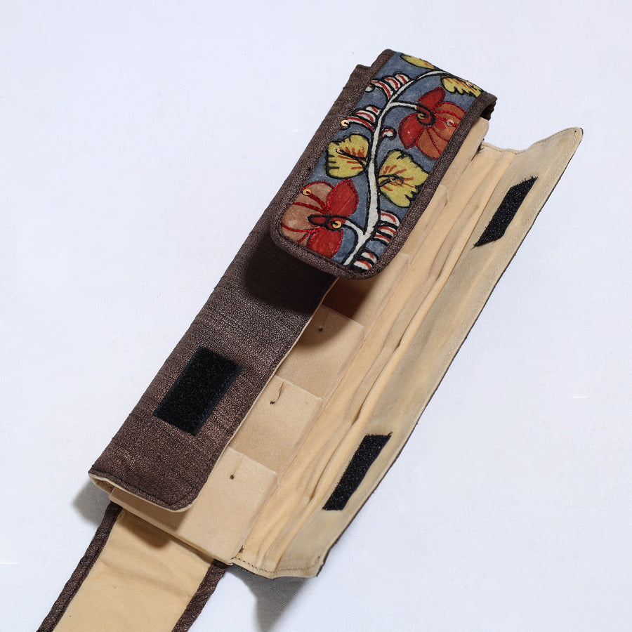 Material Brown handpainted "Bamboo Kalam’s" kalamkari natural dyed ghicha silk earrings pouch, adorned with delicate sequin work. It has six earring holders inside. This exquisite earring pouch is created with hand-painted kalamkari work, where the "kalam" or pen is used for free-hand drawing of the subject and filling in the colors. Safeguard your precious earrings with style and grace, while adding a touch of traditional elegance to your accessory collection.