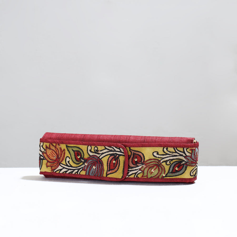 | Material | Red handpainted "Bamboo Kalam’s" kalamkari natural dyed ghicha silk earrings pouch, adorned with delicate sequin work. It has six earring holders inside. This exquisite earring pouch is created with hand-painted kalamkari work, where the "kalam" or pen is used for free-hand drawing of the subject and filling in the colors. Safeguard your precious earrings with style and grace, while adding a touch of traditional elegance to your accessory collection. |