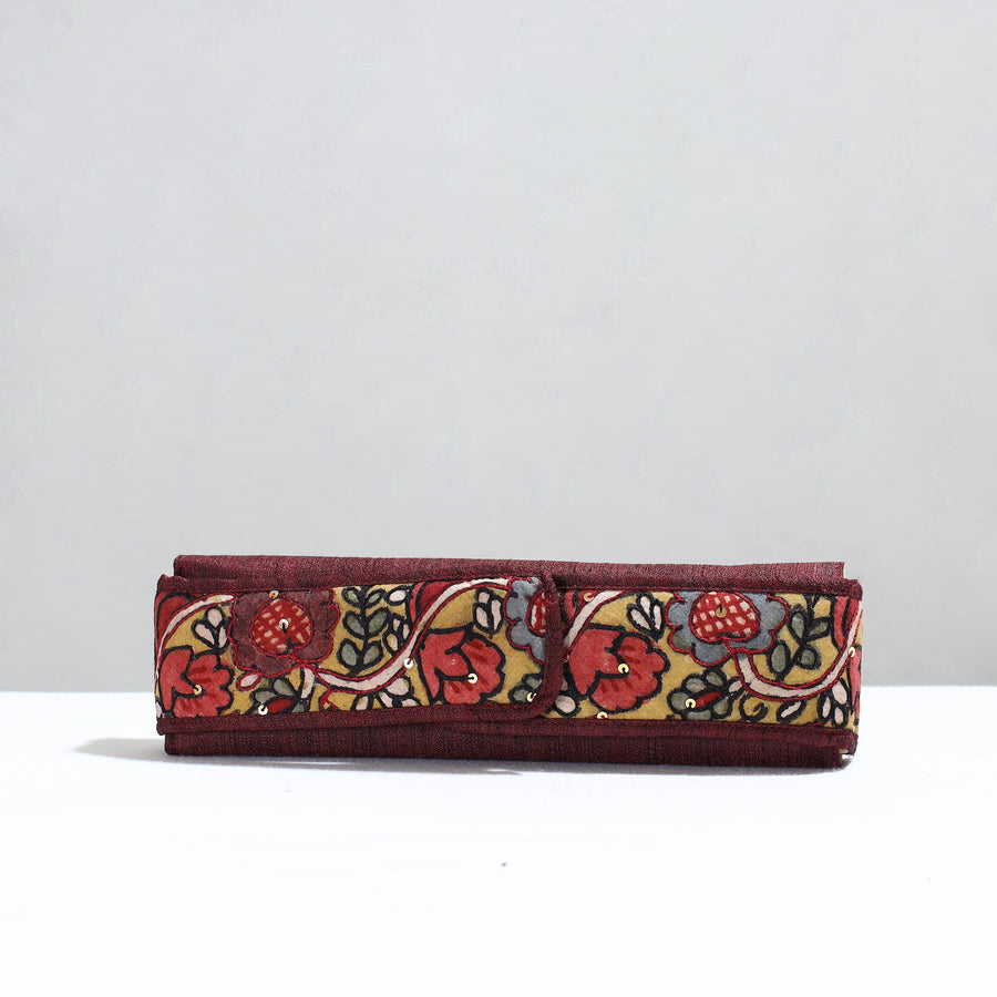 | Material | Brown handpainted "Bamboo Kalam’s" kalamkari natural dyed ghicha silk earrings pouch, adorned with delicate sequin work. It has six earring holders inside. This exquisite earring pouch is created with hand-painted kalamkari work, where the "kalam" or pen is used for free-hand drawing of the subject and filling in the colors. Safeguard your precious earrings with style and grace, while adding a touch of traditional elegance to your accessory collection. |