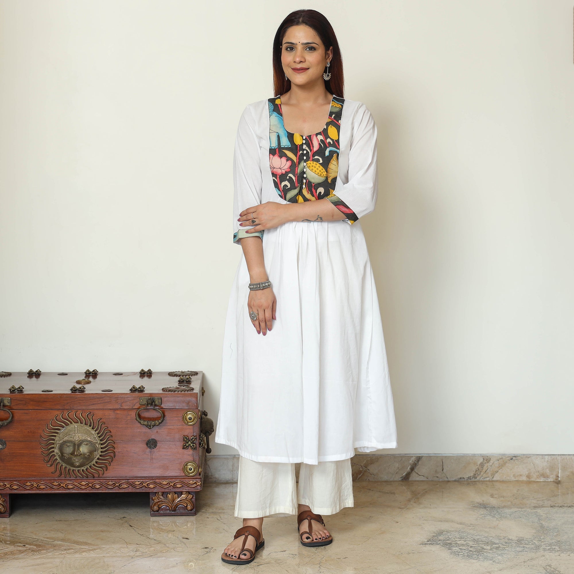 Look and feel beautiful in this uniquely designed plain cotton a-line kurta. This kurta is crafted from fine-quality cotton fabric, ensuring a comfortable feel against your skin. It boasts an exquisite srikalahasti kalamkari patchwork design, adding a touch of elegance to your ensemble. The kurta also features a convenient one-side pocket, perfect for carrying small essentials. It's an ideal choice for both casual and festive occasions.