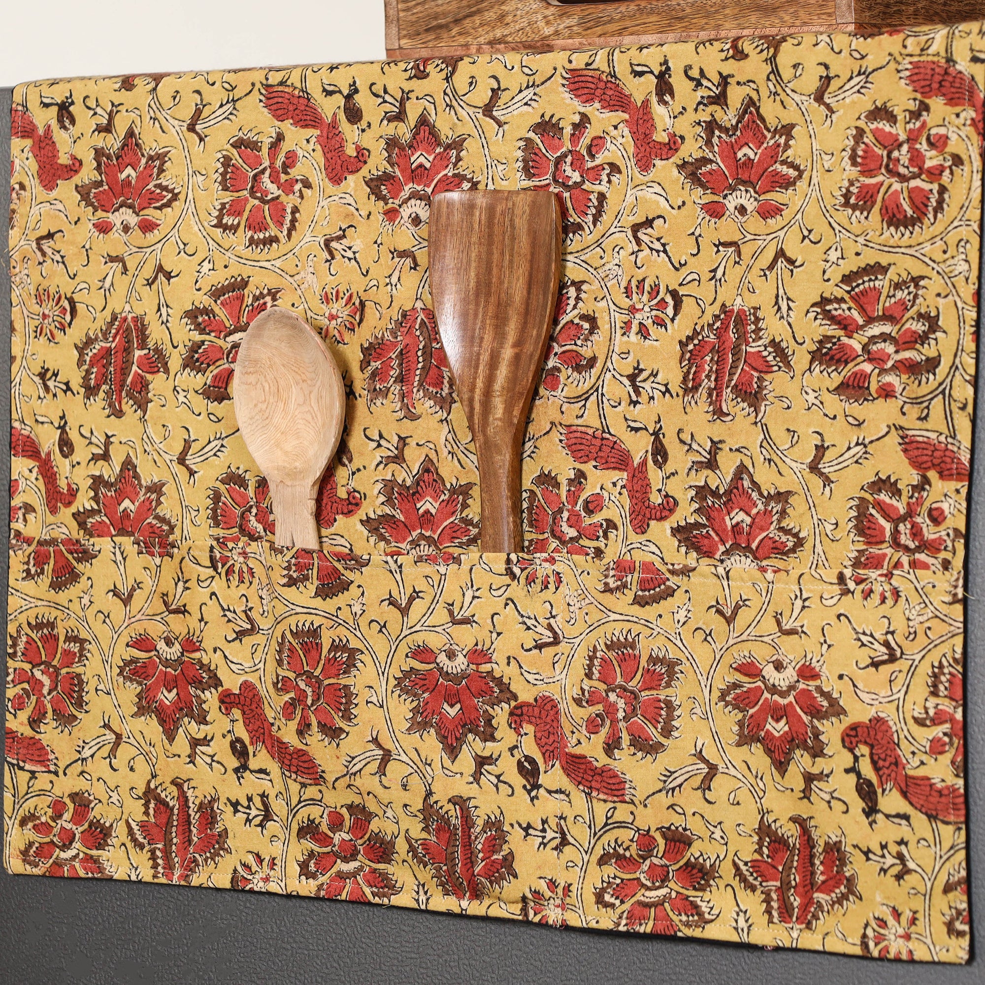 Enhance your kitchen decor and functionality with our yellow Kalamkari block-printed cotton fridge top cover with multiple pockets textured with handmade textiles from India. Made from high-quality cotton with traditional kalamkari block prints, it adds a touch of elegance and practicality to your kitchen space. This stylish cover not only protects the top of your fridge from dust and scratches but also features six pockets for convenient storage of small items.