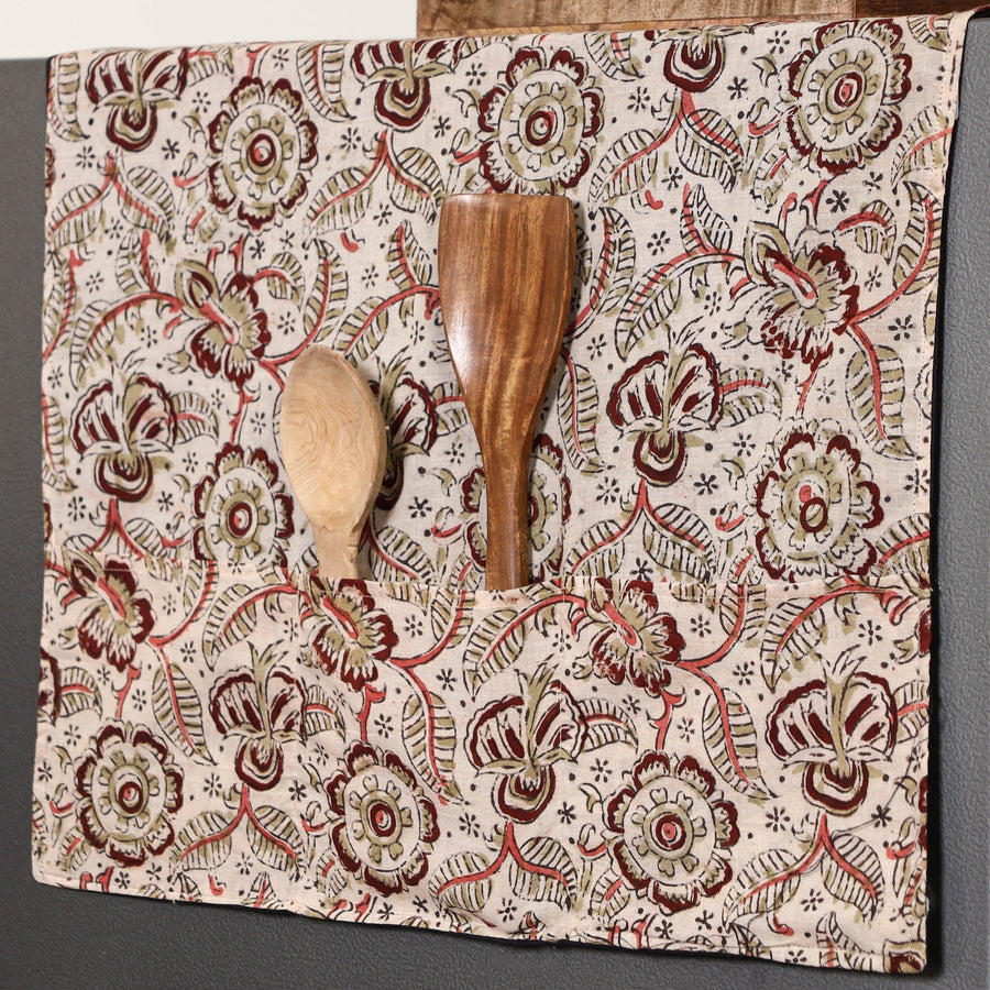 Enhance your kitchen decor and functionality with our beige Kalamkari block-printed cotton fridge top cover with multiple pockets textured with handmade textiles from India. Made from high-quality cotton with traditional kalamkari block prints, it adds a touch of elegance and practicality to your kitchen space. This stylish cover not only protects the top of your fridge from dust and scratches but also features six pockets for convenient storage of small items.