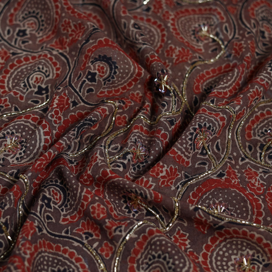 This exquisite hand-embroidered ajrakh cotton blouse piece combines traditional craftsmanship with modern elegance, making it perfect for creating unique and stylish blouses that add a touch of sophistication to any outfit. The intricate Ajrakh patterns, meticulously hand-embroidered on high-quality cotton, ensure both comfort and style, making this blouse piece a versatile addition to your wardrobe for any occasion.
