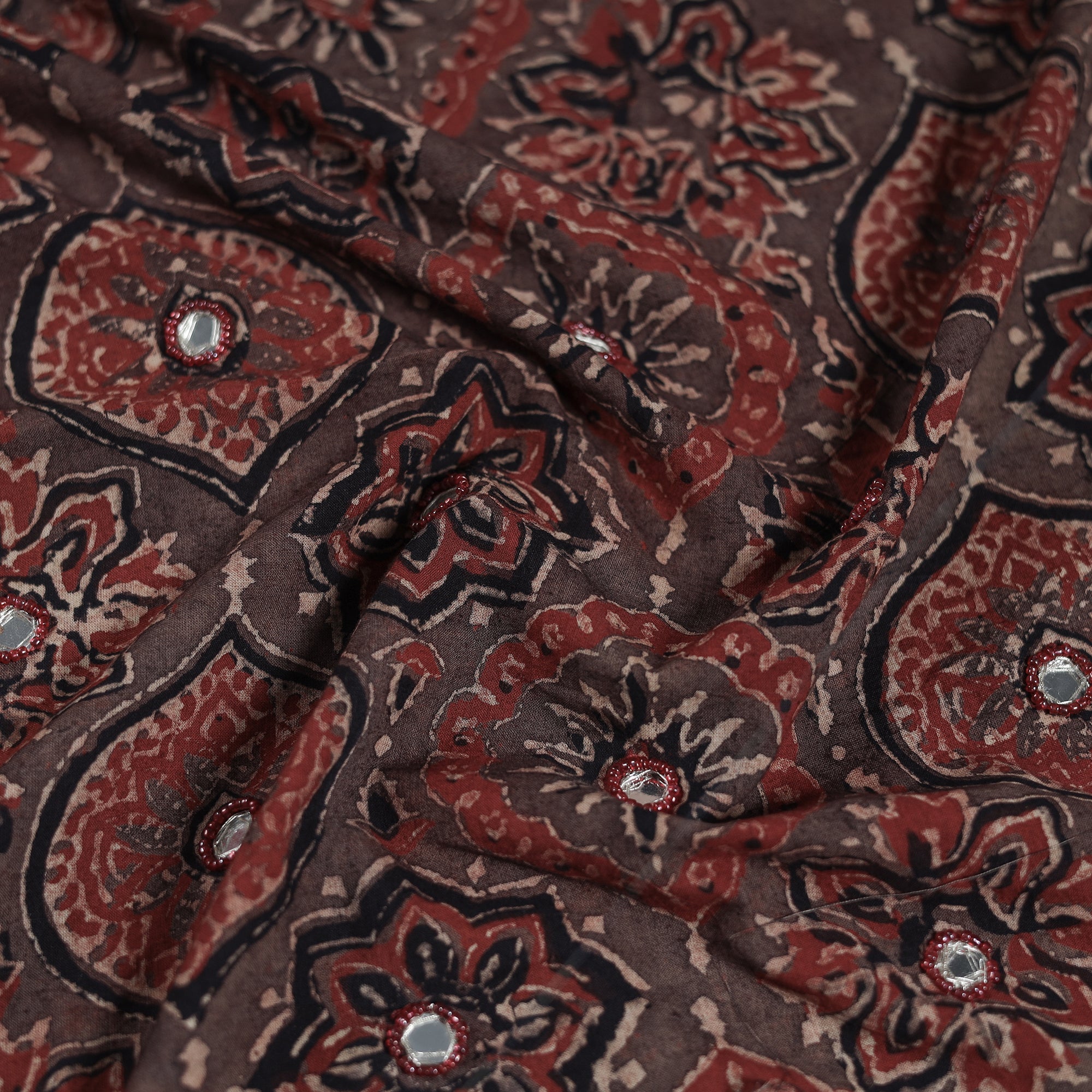 This exquisite hand-embroidered ajrakh cotton blouse piece combines traditional craftsmanship with modern elegance, making it perfect for creating unique and stylish blouses that add a touch of sophistication to any outfit. The intricate Ajrakh patterns, meticulously hand-embroidered on high-quality cotton, ensure both comfort and style, making this blouse piece a versatile addition to your wardrobe for any occasion.