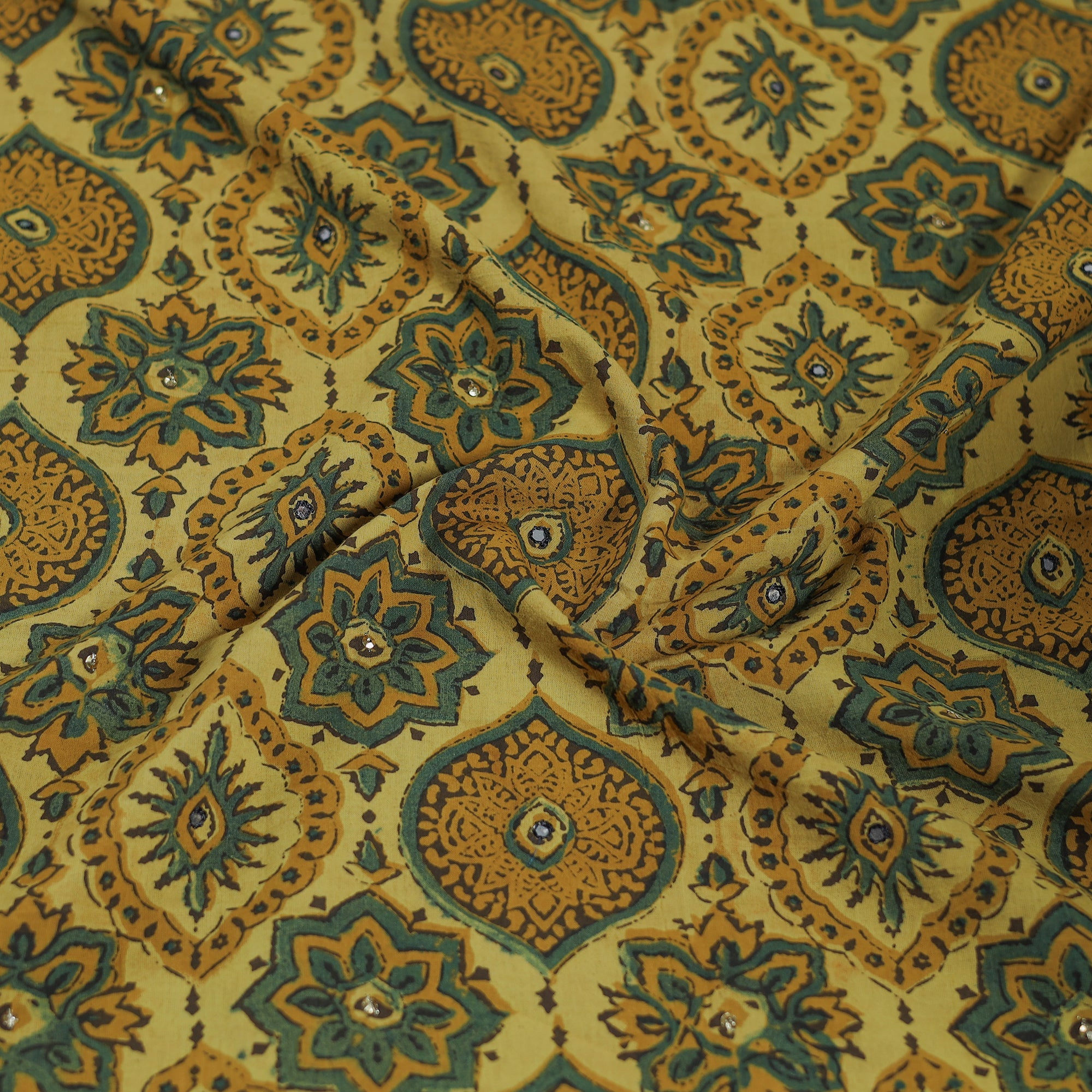 This exquisite hand-embroidered yellow ajrakh cotton blouse piece combines traditional craftsmanship with modern elegance, making it perfect for creating unique and stylish blouses that add a touch of sophistication to any outfit. The intricate Ajrakh patterns, meticulously hand-embroidered on high-quality cotton, ensure both comfort and style, making this blouse piece a versatile addition to your wardrobe for any occasion.