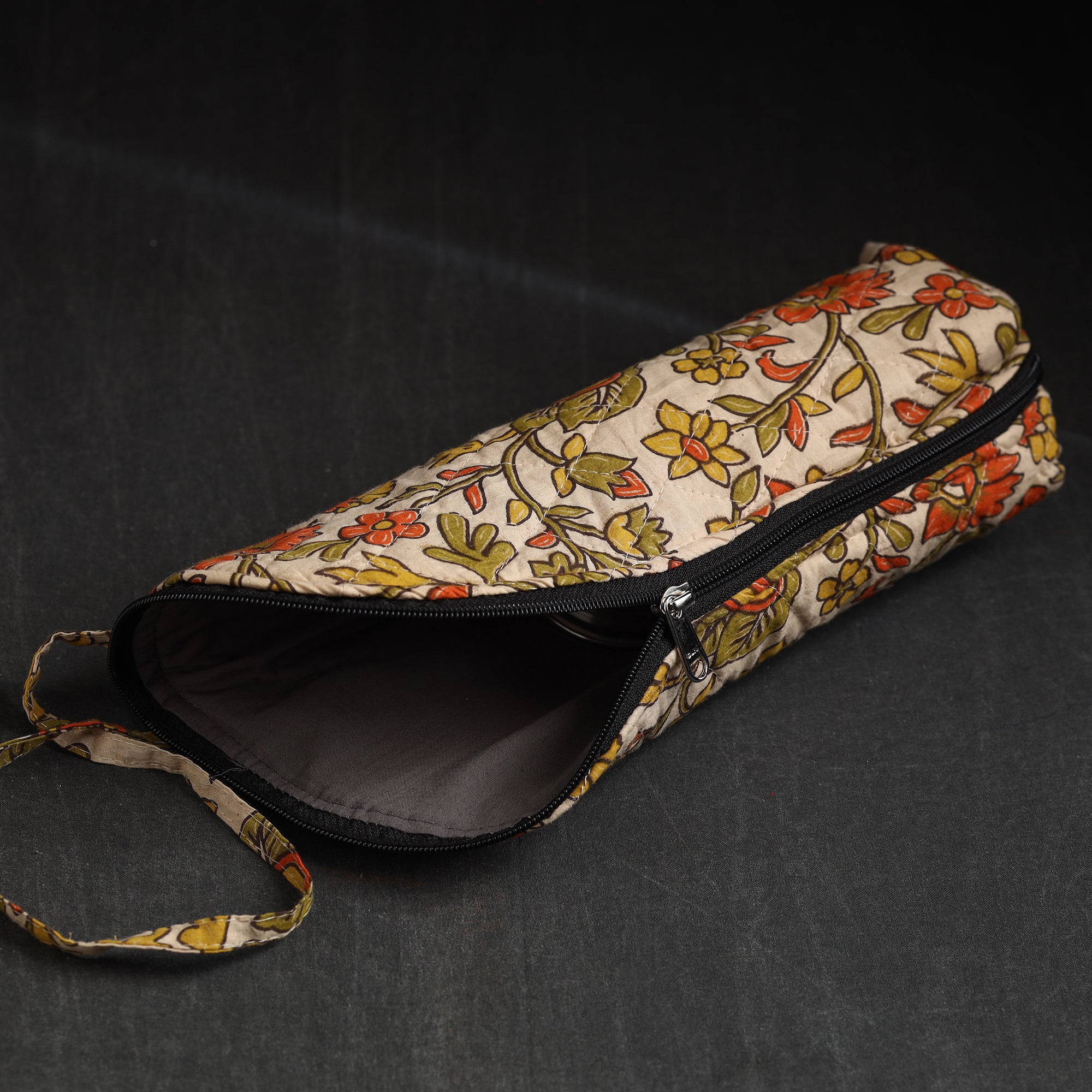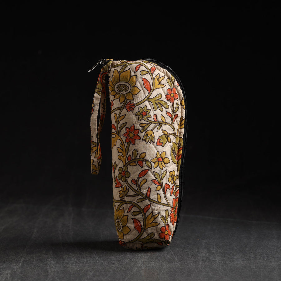 This handmade printed beige cotton water bottle cover is a charming blend of tradition and functionality. It has a cotton lining inside and a zipper main closure. Crafted from high-quality cotton, this cover adds a touch of elegance to your hydration routine. Designed to fit most bottles, it keeps your drink insulated and protects the bottle from scratches or dents while making a fashion statement.