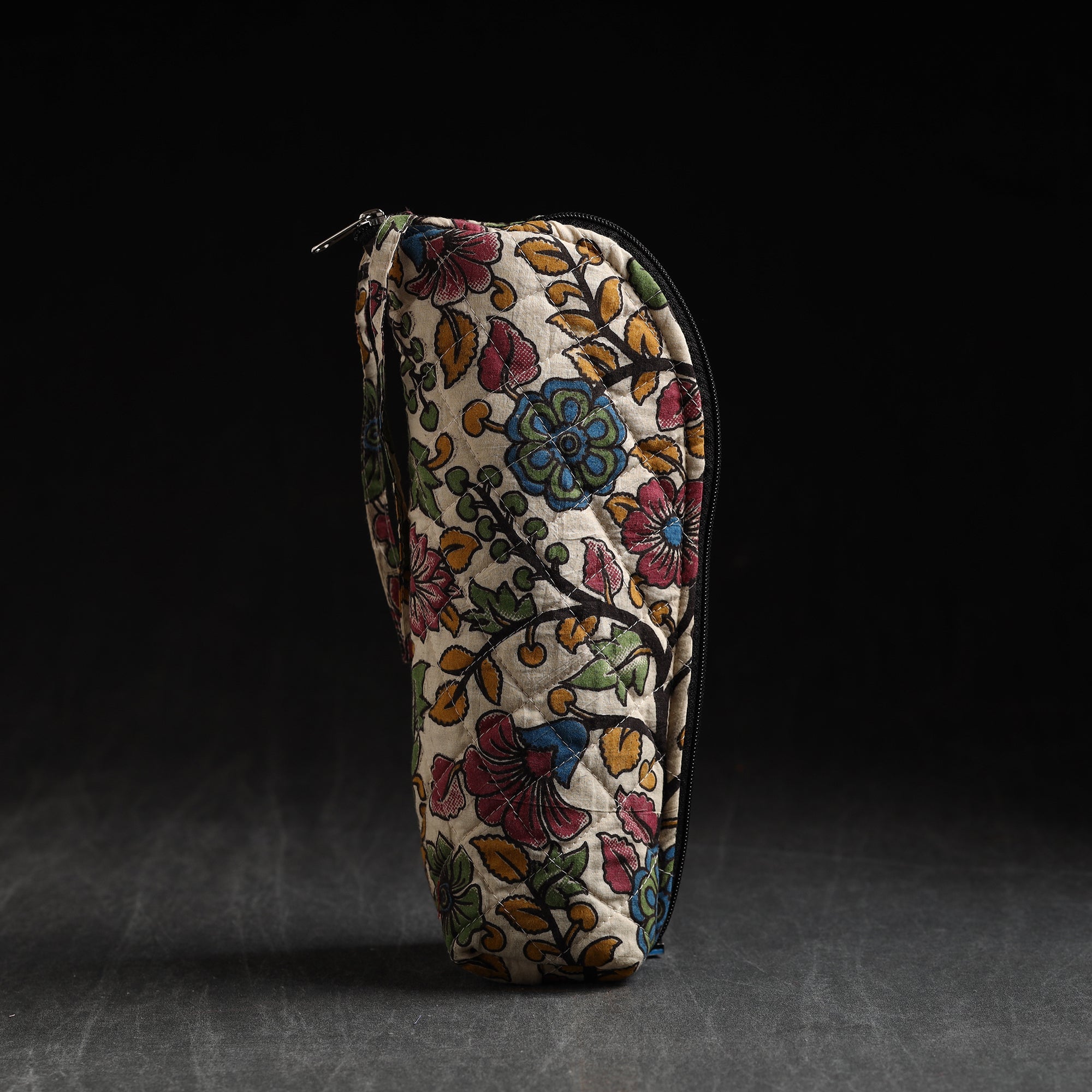 This handmade printed beige cotton water bottle cover is a charming blend of tradition and functionality. It has a cotton lining inside and a zipper main closure. Crafted from high-quality cotton, this cover adds a touch of elegance to your hydration routine. Designed to fit most bottles, it keeps your drink insulated and protects the bottle from scratches or dents while making a fashion statement.