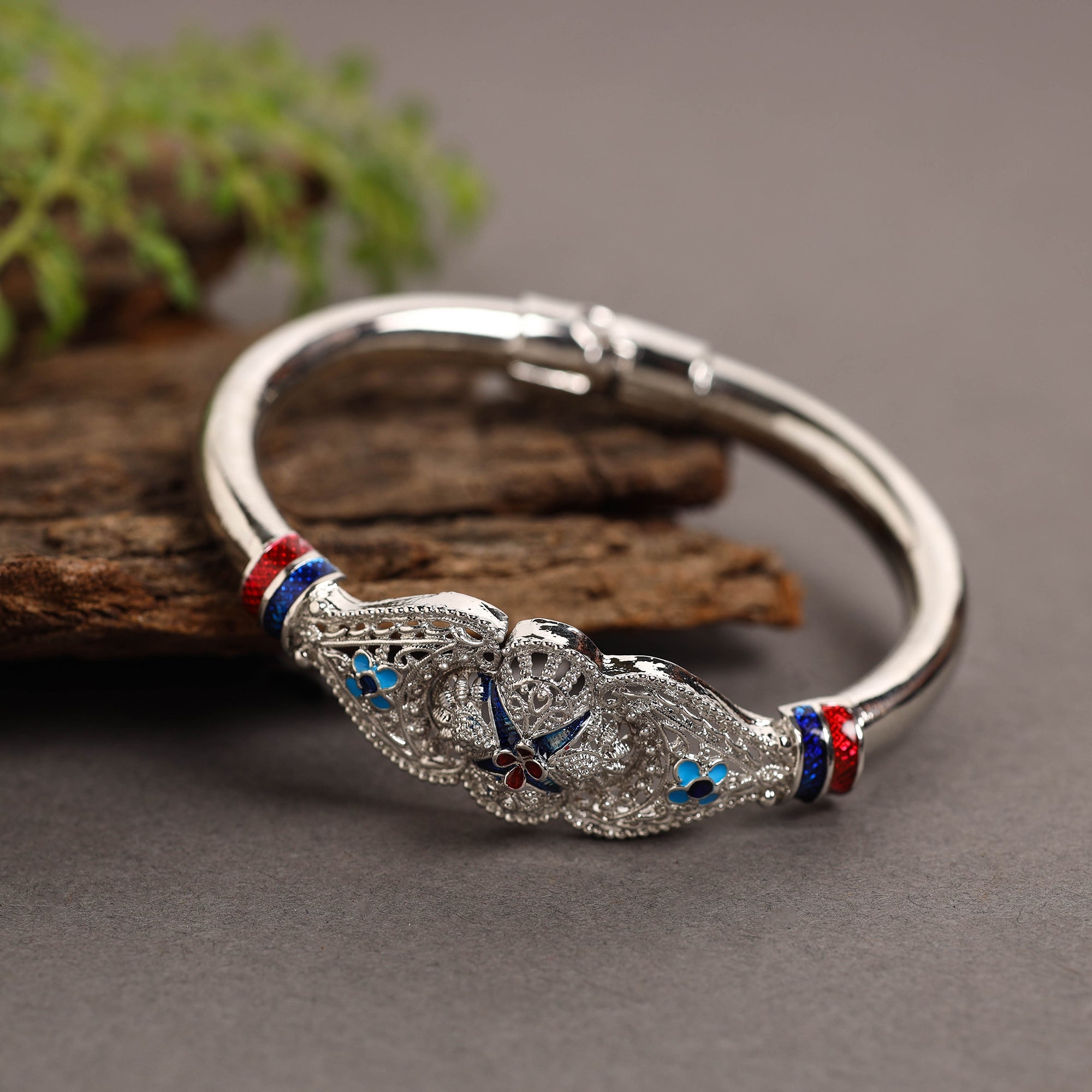 | Material | Made with bronze alloy and traditional enameling. Beautifully handcrafted paka meenakari bracelet by Sukhomoy Mukherjee A true masterpiece of traditional artistry, it adds cultural elegance to any outfit, making it perfect for both special occasions and everyday wear. |