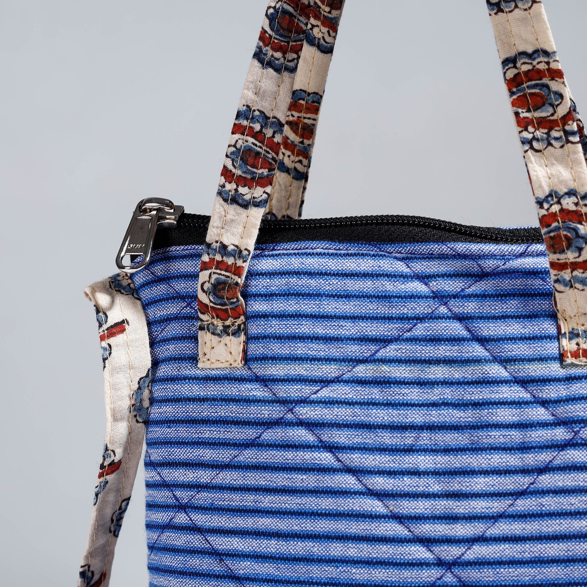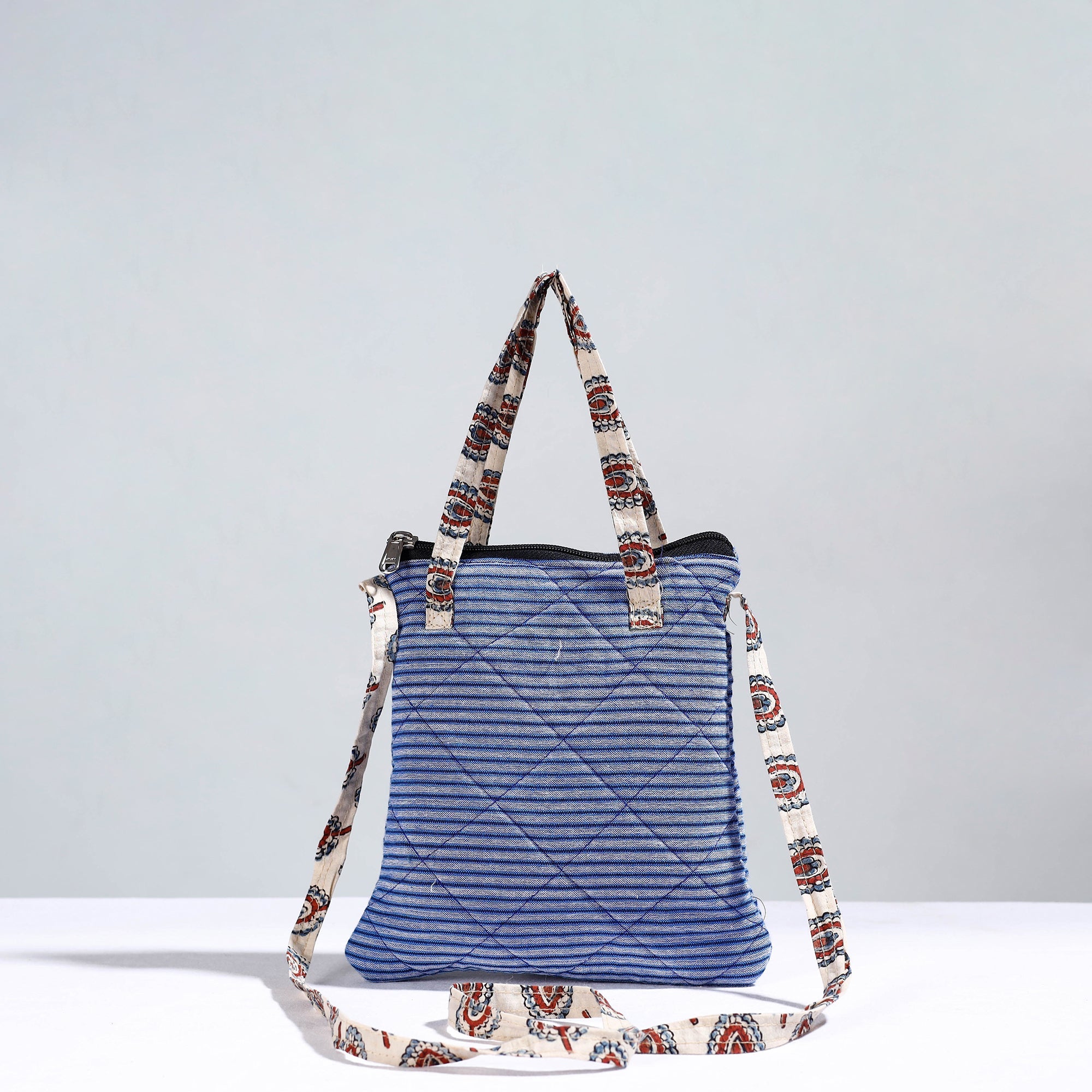 | Material | Blue handmade quilted cotton sling bag by Noori Bazar. This sling bag is made from a blend of cotton fabrics. This sling bag boasts four convenient pockets, providing ample space for your essentials. The foam layer lining ensures durability and protection. |
