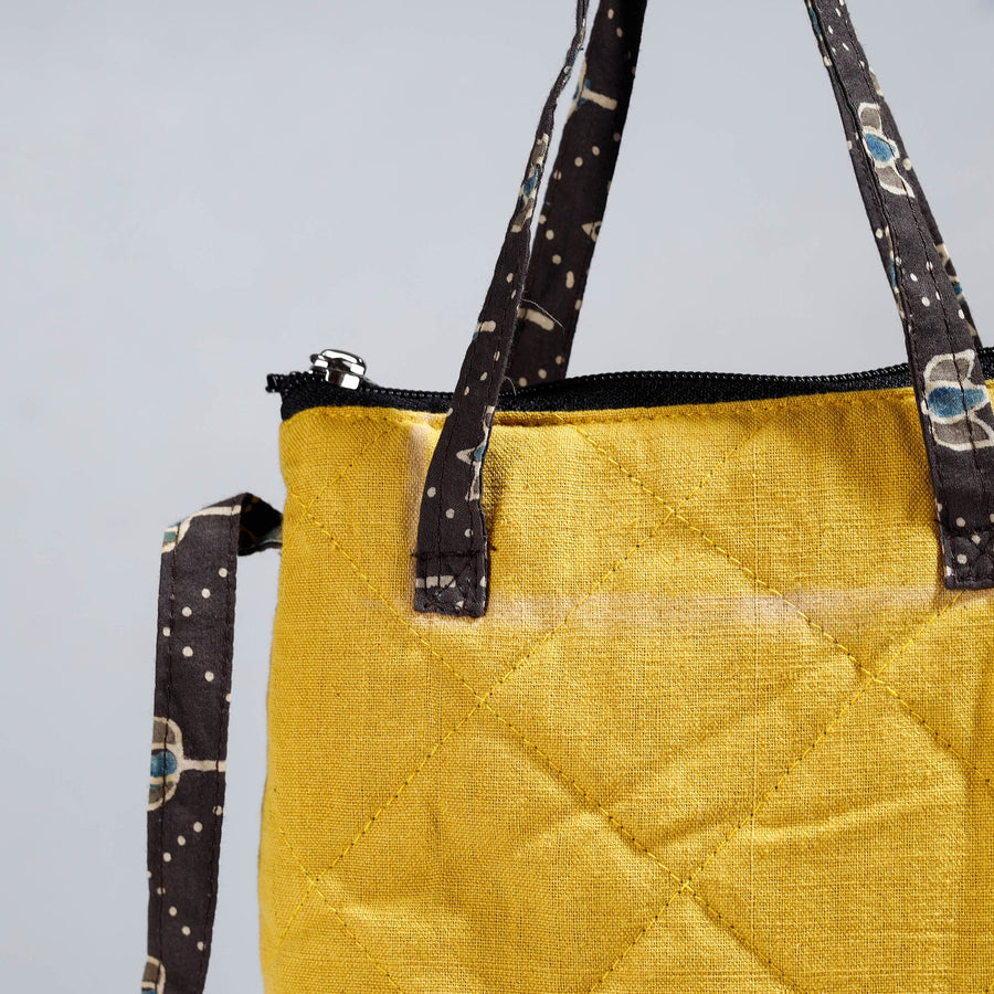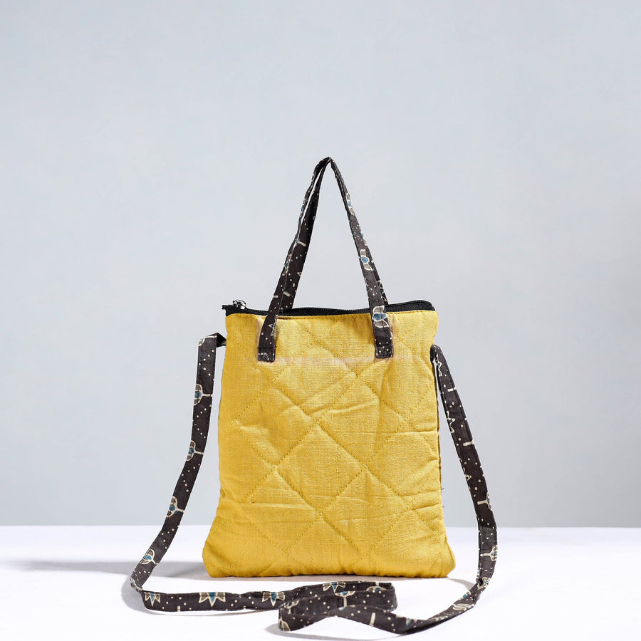 Yellow handmade quilted cotton sling bag by Noori Bazar. This sling bag is made from a blend of cotton fabrics. This sling bag boasts four convenient pockets, providing ample space for your essentials. The foam layer lining ensures durability and protection.