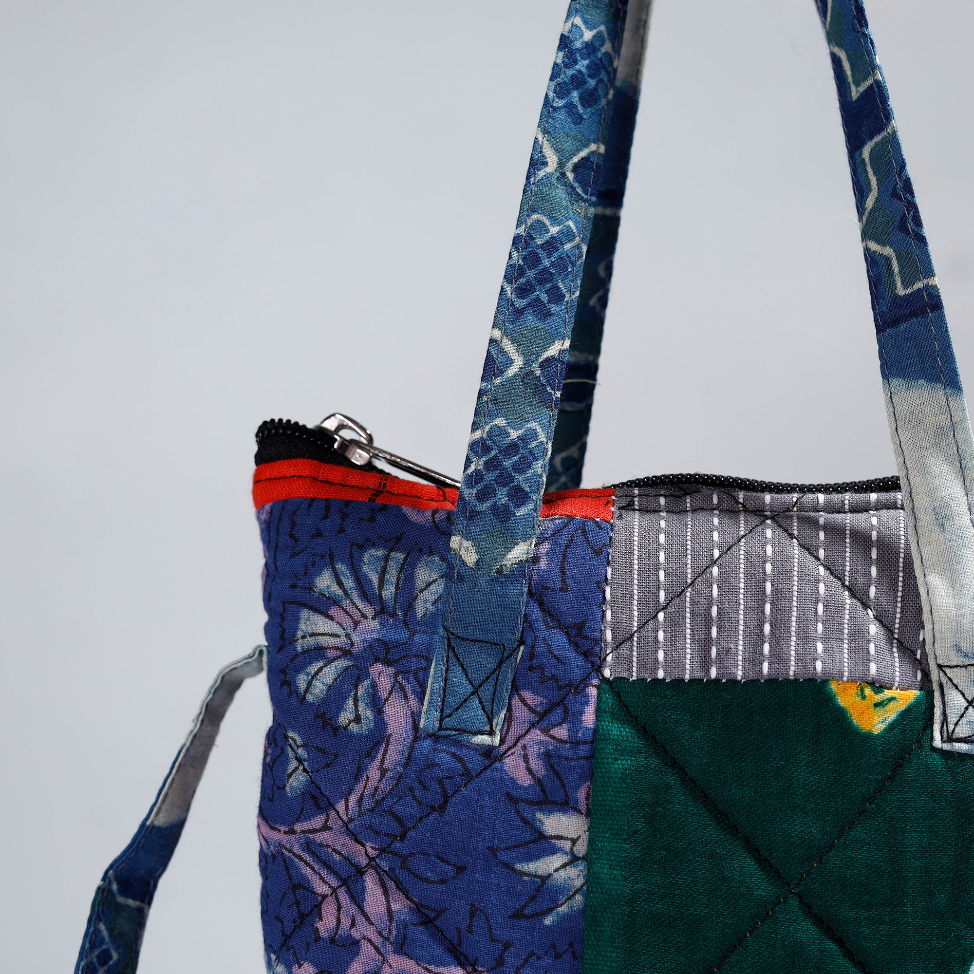 Multicolor handmade quilted cotton patchwork sling bag by Noori Bazar. This sling bag is made from a blend of cotton fabrics. This sling bag boasts four convenient pockets, providing ample space for your essentials. The foam layer lining ensures durability and protection.