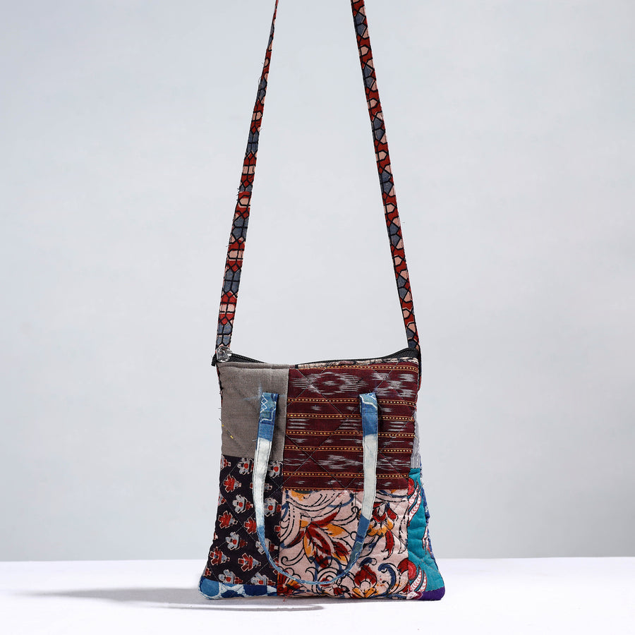 Multicolor handmade quilted cotton patchwork sling bag by Noori Bazar. This sling bag is made from a blend of cotton fabrics. This sling bag boasts four convenient pockets, providing ample space for your essentials. The foam layer lining ensures durability and protection.
