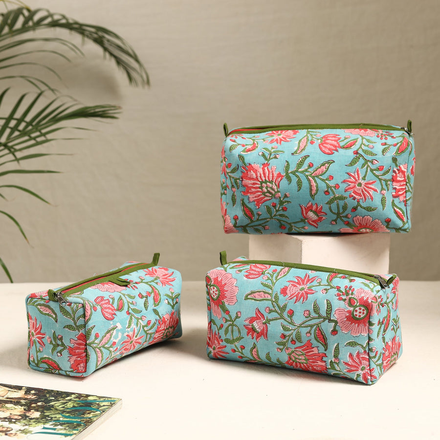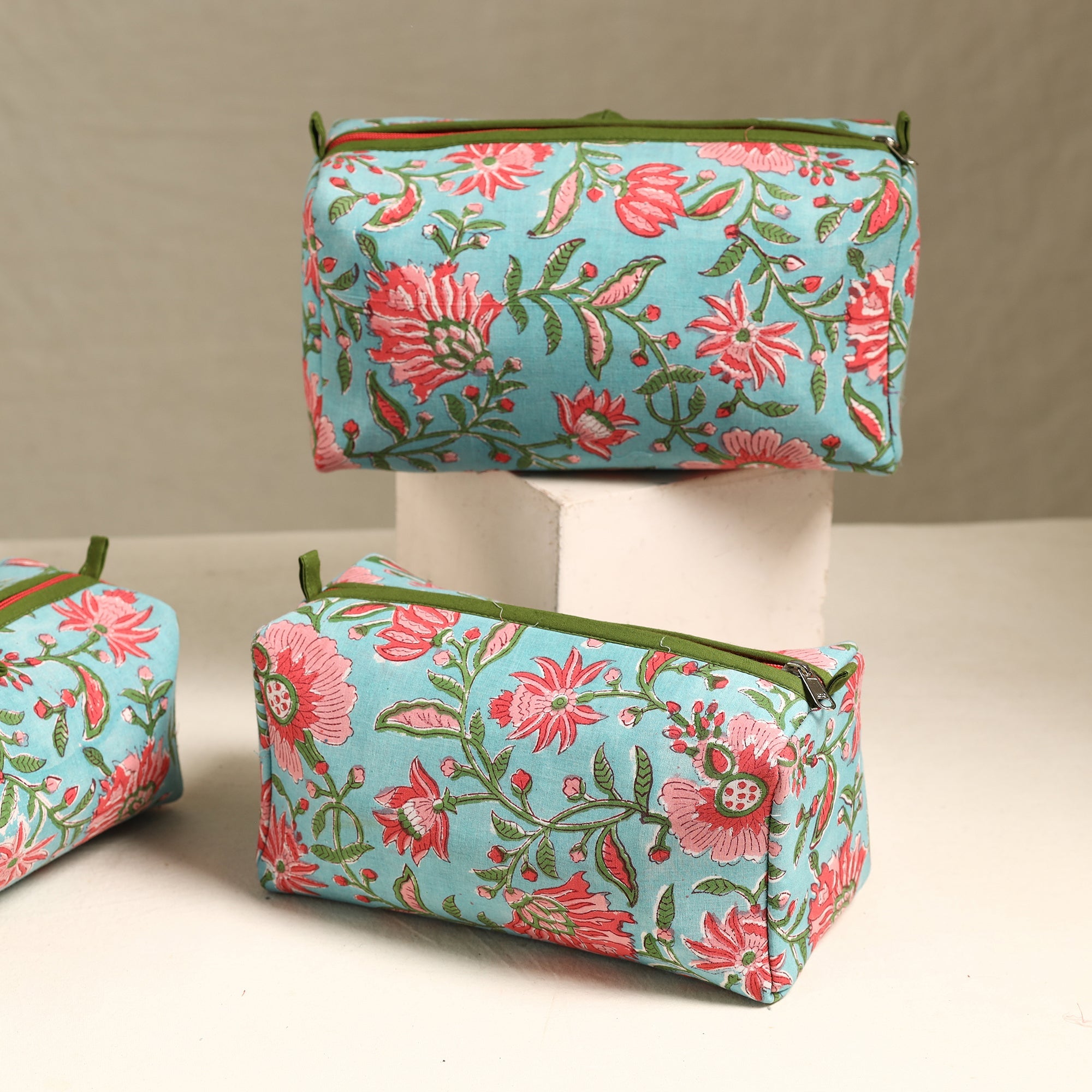 Handmade blue multipurpose cosmetic/toiletry bags made from cotton fabric. It's perfect for organizing toiletries, cosmetics, or travel essentials. It ensures your belongings stay secure and stylish, whether at home or on the go.