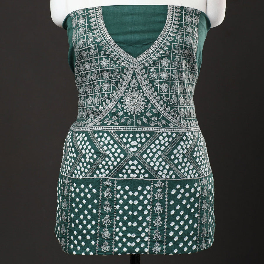 This kutch bandhani tie-dye sequin work suit material set is crafted using high-quality materials to ensure both comfort and durability. the sequin work satin cotton kurta set, including the bottom material and matching dupatta. This suit material features a majestic bandhani pattern, tie-dyed using the traditional technique practiced by the artisans of Kutch. This process begins by tightly tying the fabric with a thread at several points, creating patterns and motifs. This vibrant bandhani suit material set is perfect for creating stylish and comfortable outfits.
