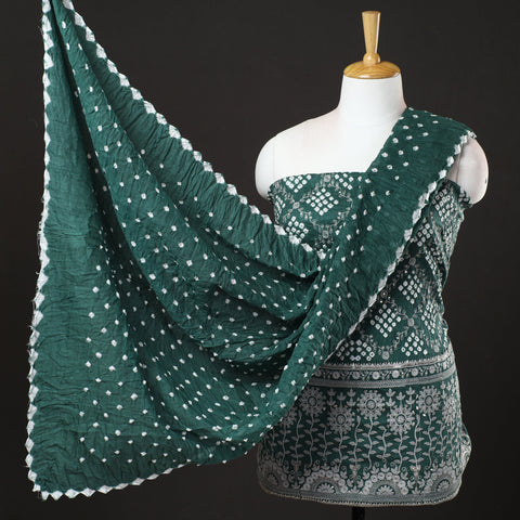 Green - 3pc Kutch Bandhani Tie-Dye Sequin Work Satin Cotton Unstitched Suit Material Set 45