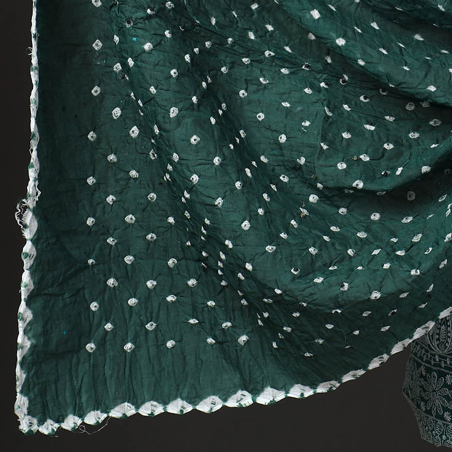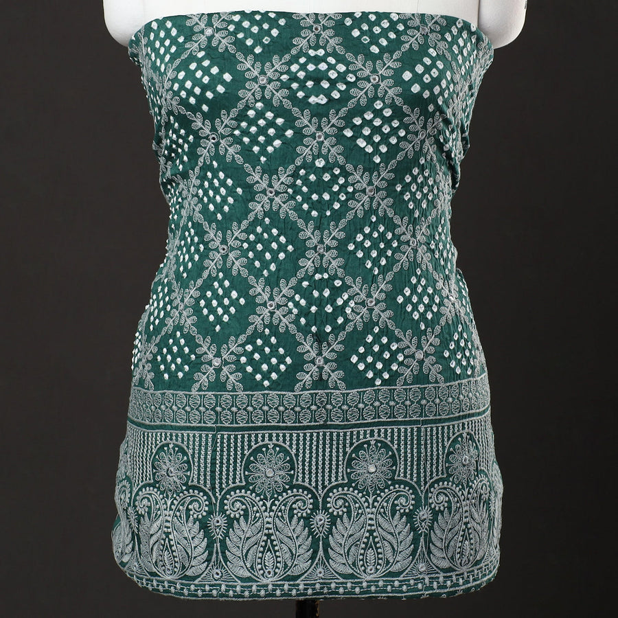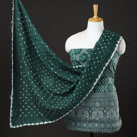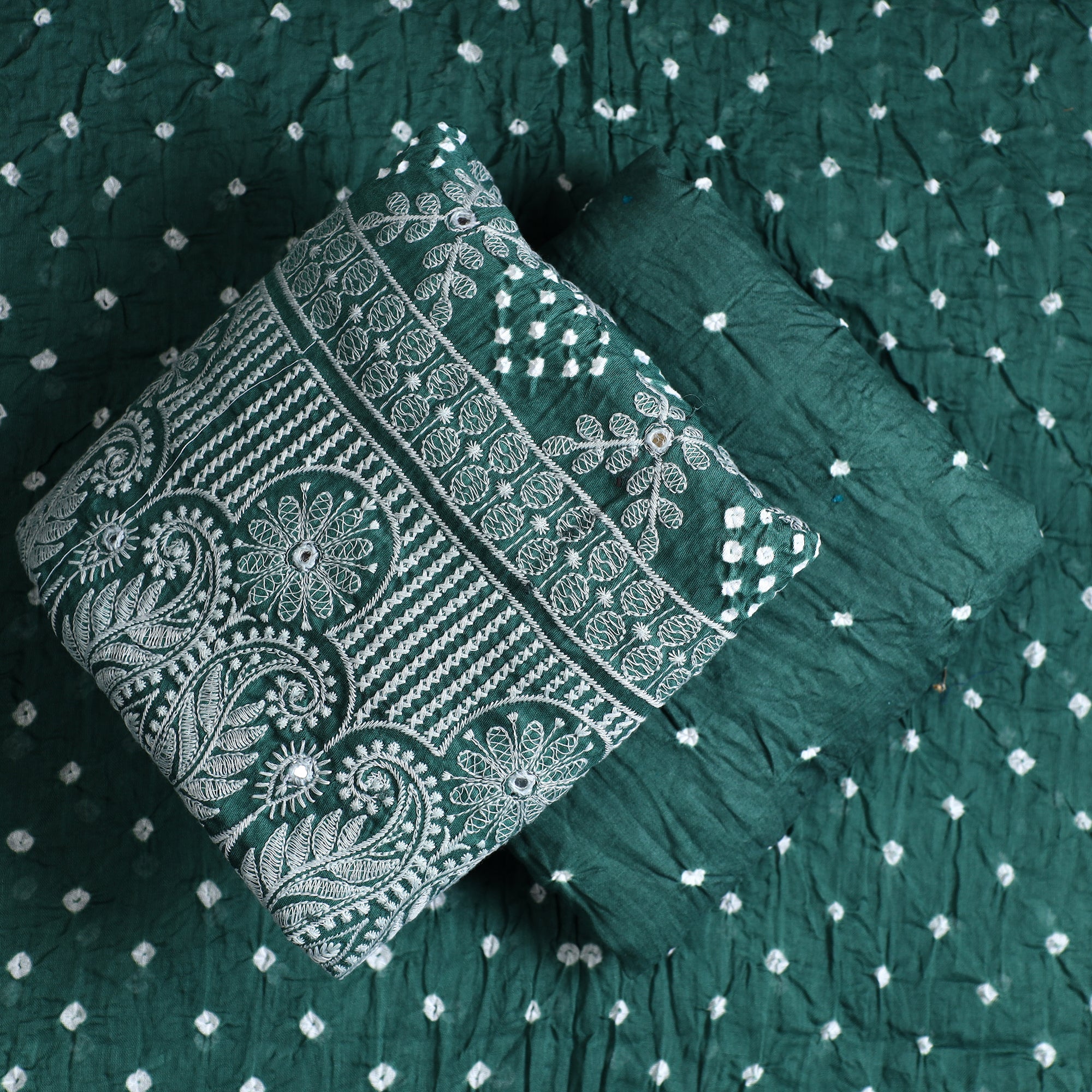This kutch bandhani tie-dye mirror work suit material set is crafted using high-quality materials to ensure both comfort and durability. the mirror-work satin cotton kurta set, including the bottom material and matching dupatta. This suit material features a majestic bandhani pattern, tie-dyed using the traditional technique practiced by the artisans of Kutch. This process begins by tightly tying the fabric with a thread at several points, creating patterns and motifs. This vibrant bandhani suit material set is perfect for creating stylish and comfortable outfits.