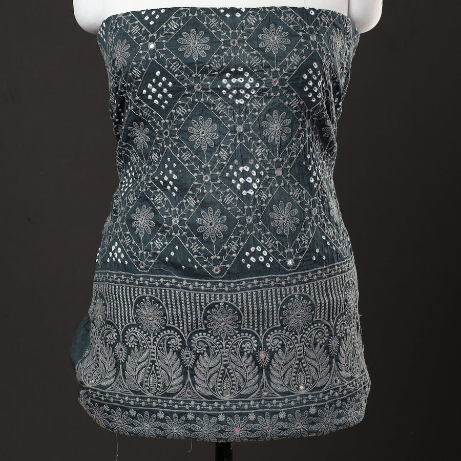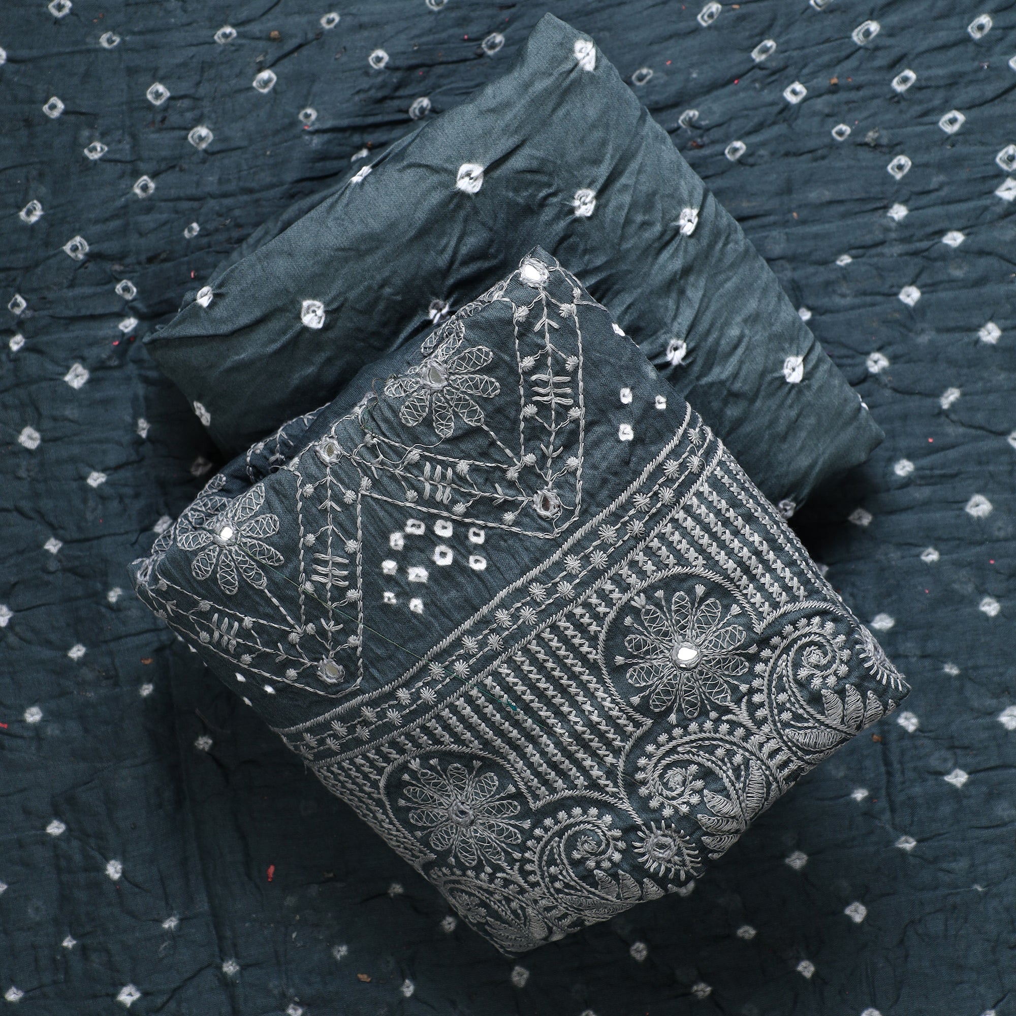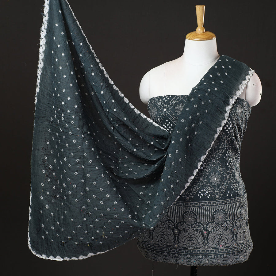 This kutch bandhani tie-dye mirror work suit material set is crafted using high-quality materials to ensure both comfort and durability. the mirror-work satin cotton kurta set, including the bottom material and matching dupatta. This suit material features a majestic bandhani pattern, tie-dyed using the traditional technique practiced by the artisans of Kutch. This process begins by tightly tying the fabric with a thread at several points, creating patterns and motifs. This vibrant bandhani suit material set is perfect for creating stylish and comfortable outfits.