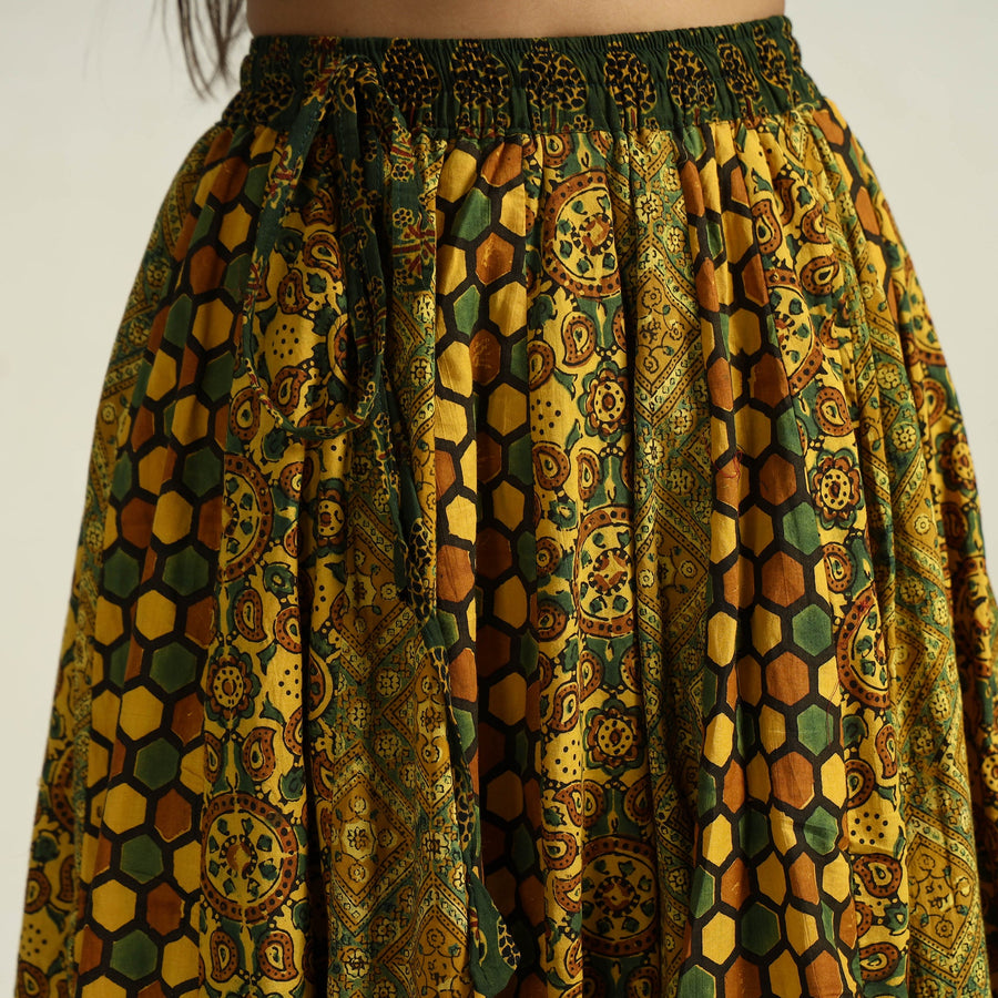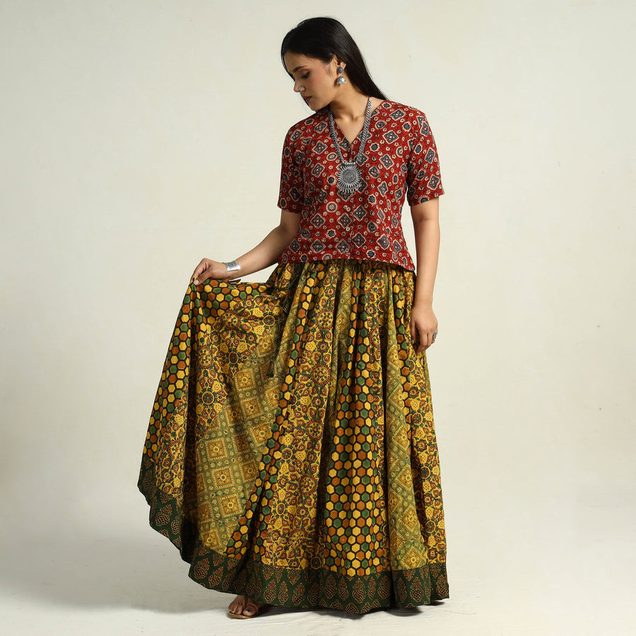 Elevate your wardrobe with our yellow patchwork long skirt, skillfully crafted from ajrakh block-printed, natural-dyed cotton fabric. This skirt boasts a waist tie-up closure, allowing for a customized and comfortable fit. The patchwork 24-kali design adds a unique touch, showcasing the skilled craftsmanship behind its creation. The intricate patterns and vibrant colors reflect the cultural heritage of Gujarat. Perfect for both casual and semi-formal occasions.