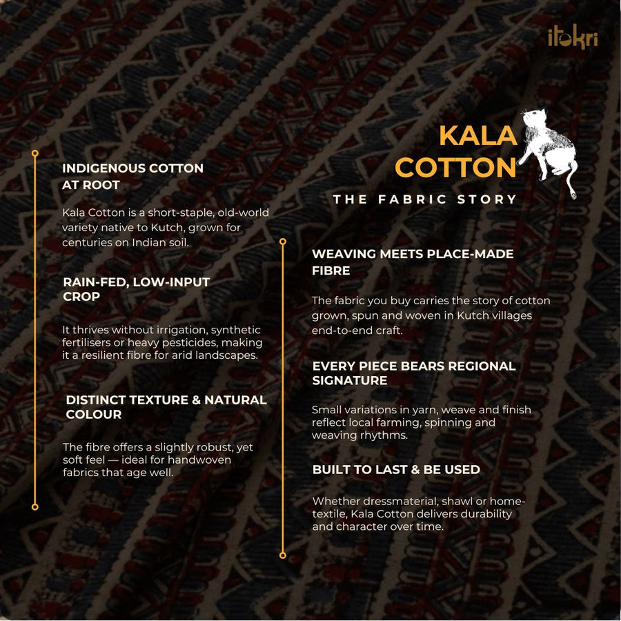 Kala cotton is a type of organic cotton grown in the Kutch district of Bhuj district (Gujarat). Compared to other industrially grown cotton fabrics, it is considered genetically pure cotton and is suitable for cultivation in the Kutch region.