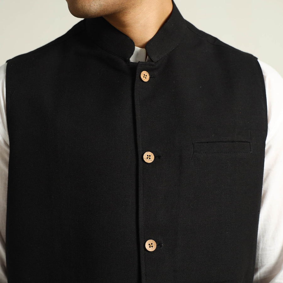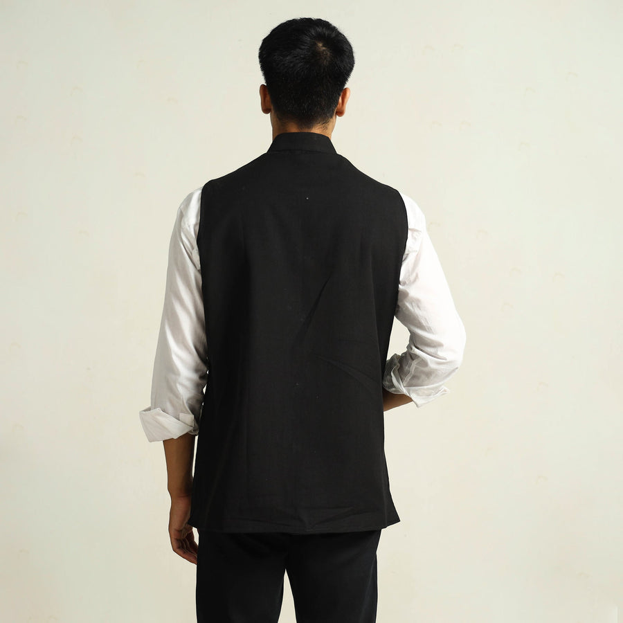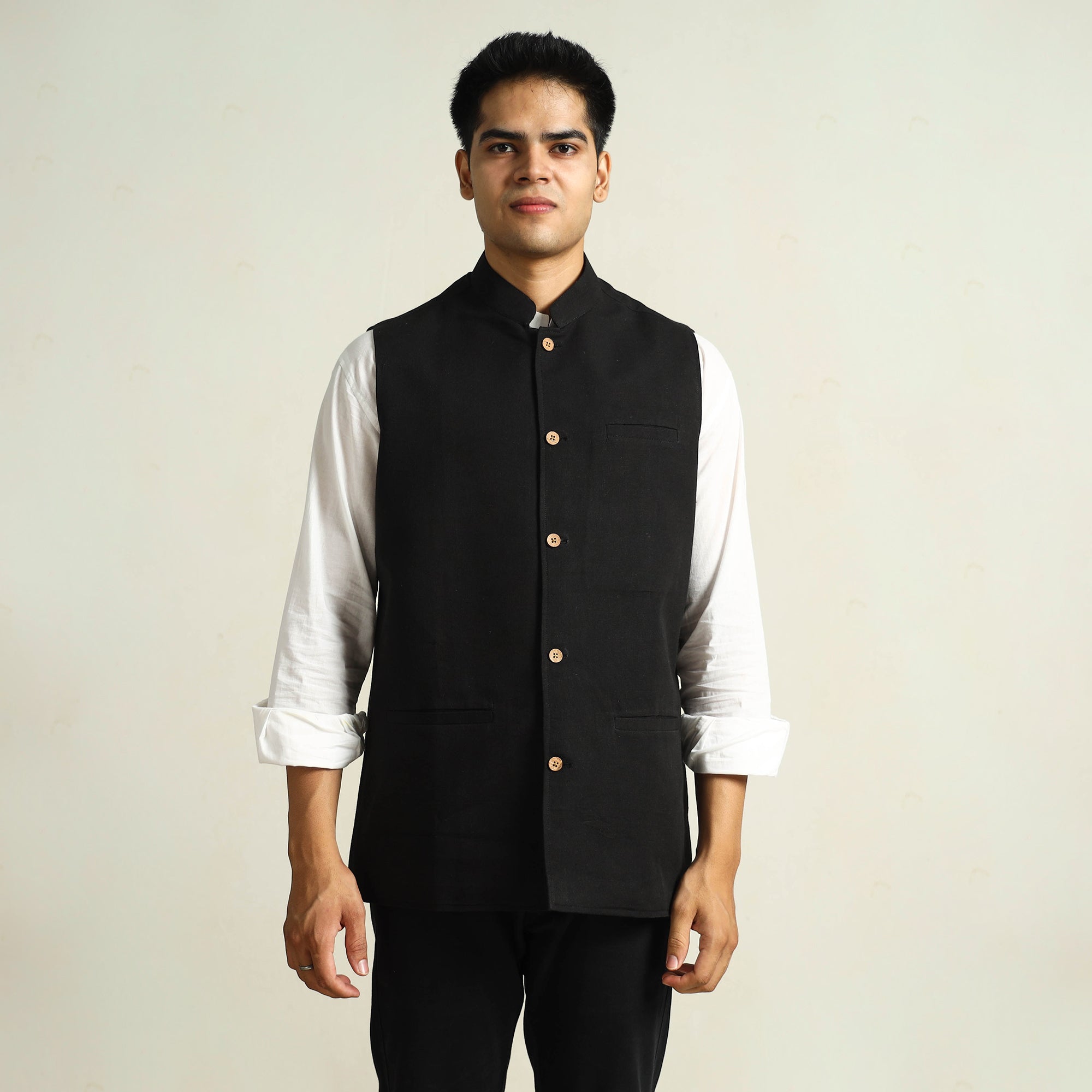 Stylish and comfortable, this pure cotton handloom nehru jacket for men features traditional craftsmanship with modern appeal. this sleeveless jacket boasts a Chinese collar and a full-button placket, exuding sophistication. The three outer pockets add functional flair.