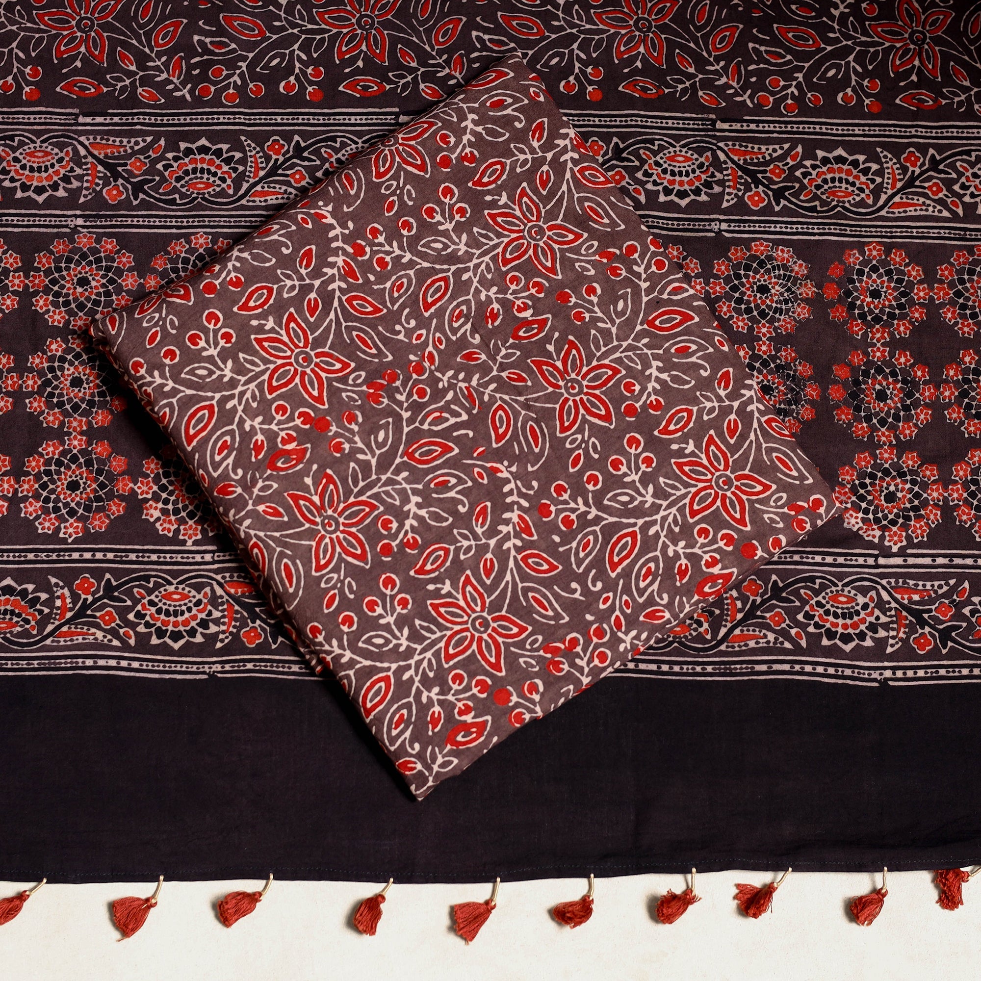 Fine quality black ajrakh hand-block-printed cotton 3-piece suit material set from Kutch. This exquisite set is handcrafted with the utmost care and skill, showcasing the traditional ajrakh technique of hand block printing practiced by the skilled artisans in the kutch region of Gujarat. Each piece is made using natural dyes, reflecting the rich heritage of ajrakh and adding a touch of eco-friendliness to your attire.