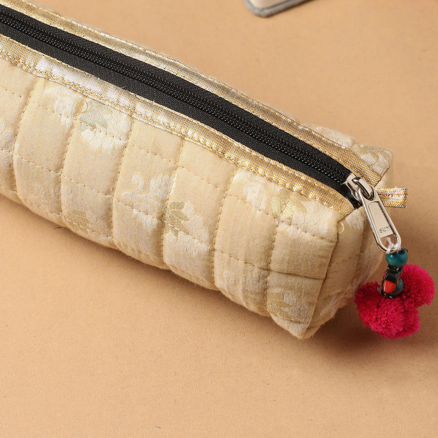 Experience the perfect blend of artistry and utility with our handcrafted quilted banarasi multipurpose/pencil pouch. This pouch is made from banarasi silk cotton fabric with quilted filling. Safely store your pencils, pens, and other essentials in style.
