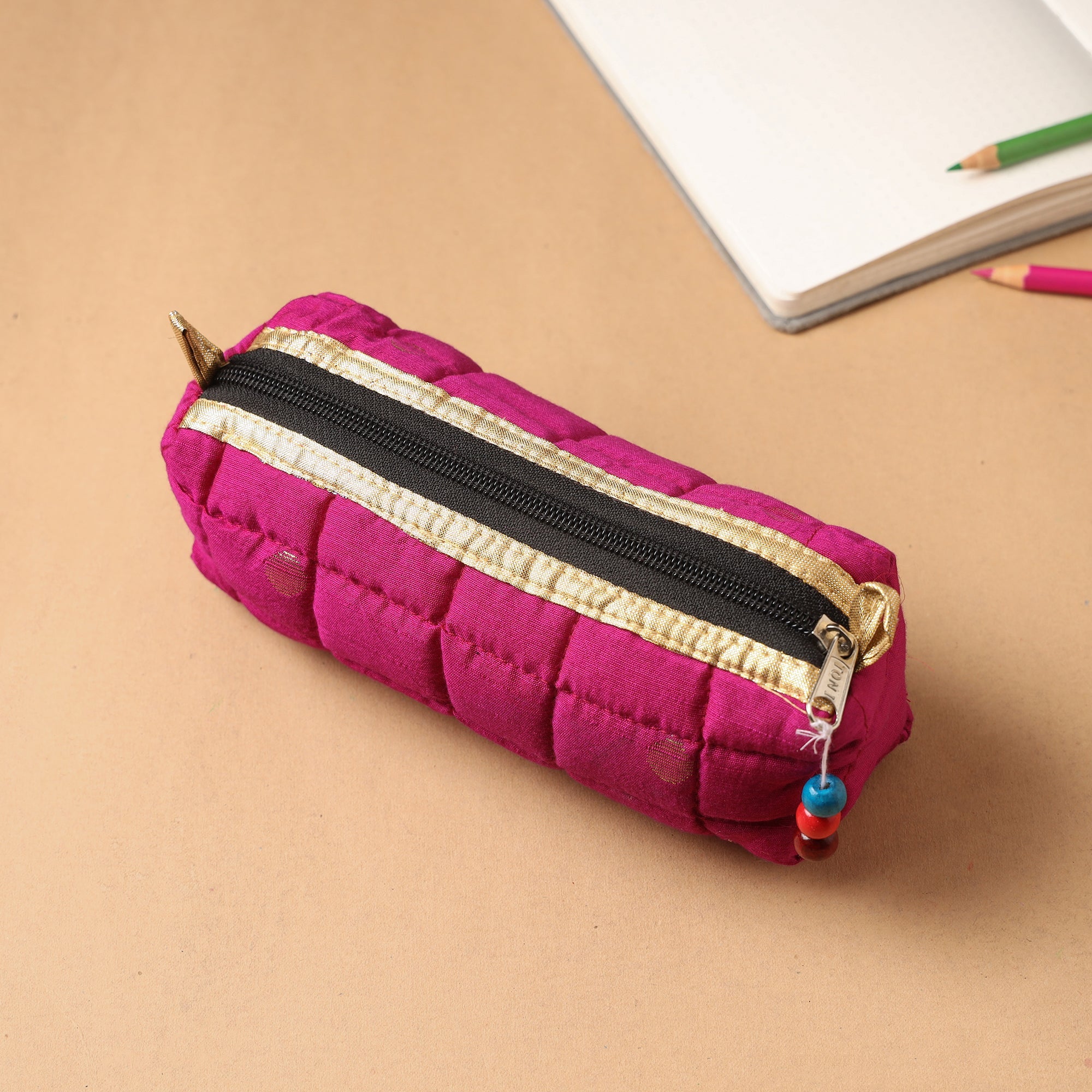 Experience the perfect blend of artistry and utility with our handcrafted quilted banarasi multipurpose/pencil pouch. This pouch is made from banarasi silk cotton fabric with quilted filling. Safely store your pencils, pens, and other essentials in style.