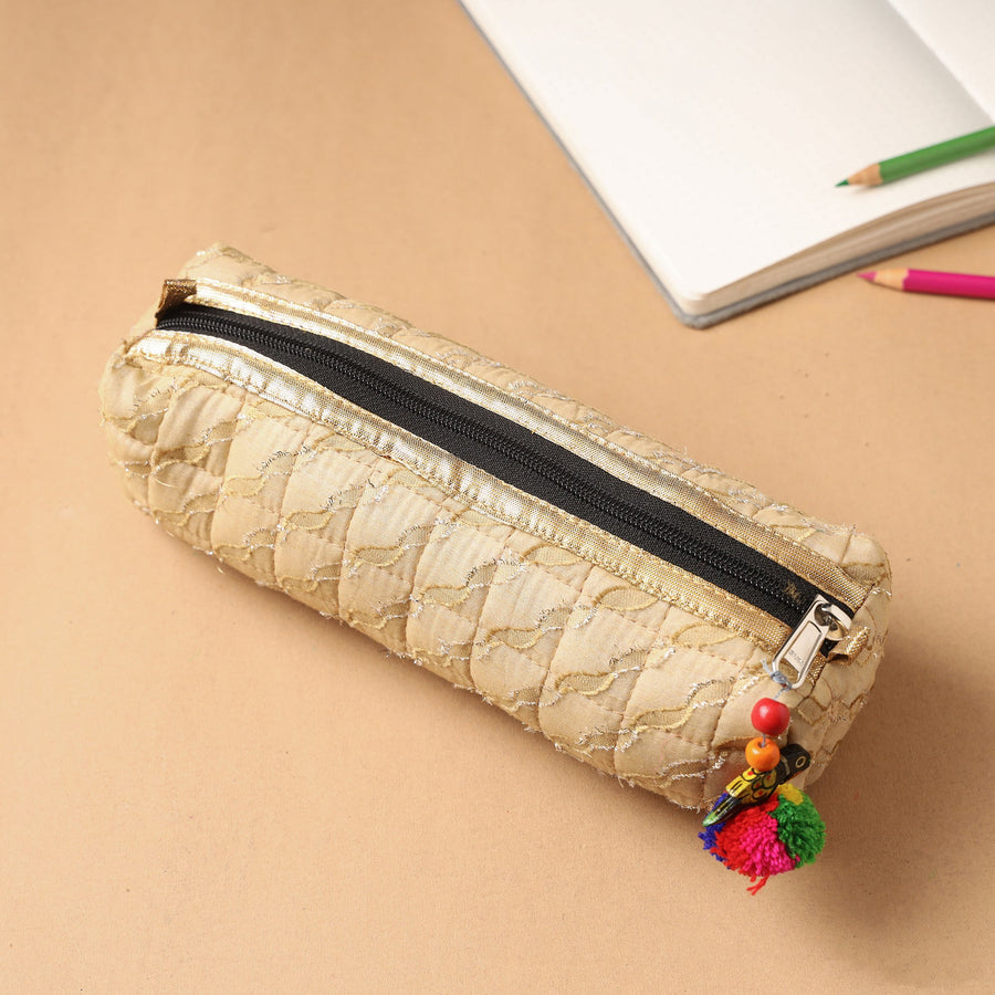 Experience the perfect blend of artistry and utility with our handcrafted quilted banarasi multipurpose/pencil pouch. This pouch is made from banarasi silk cotton fabric with quilted filling. Safely store your pencils, pens, and other essentials in style.