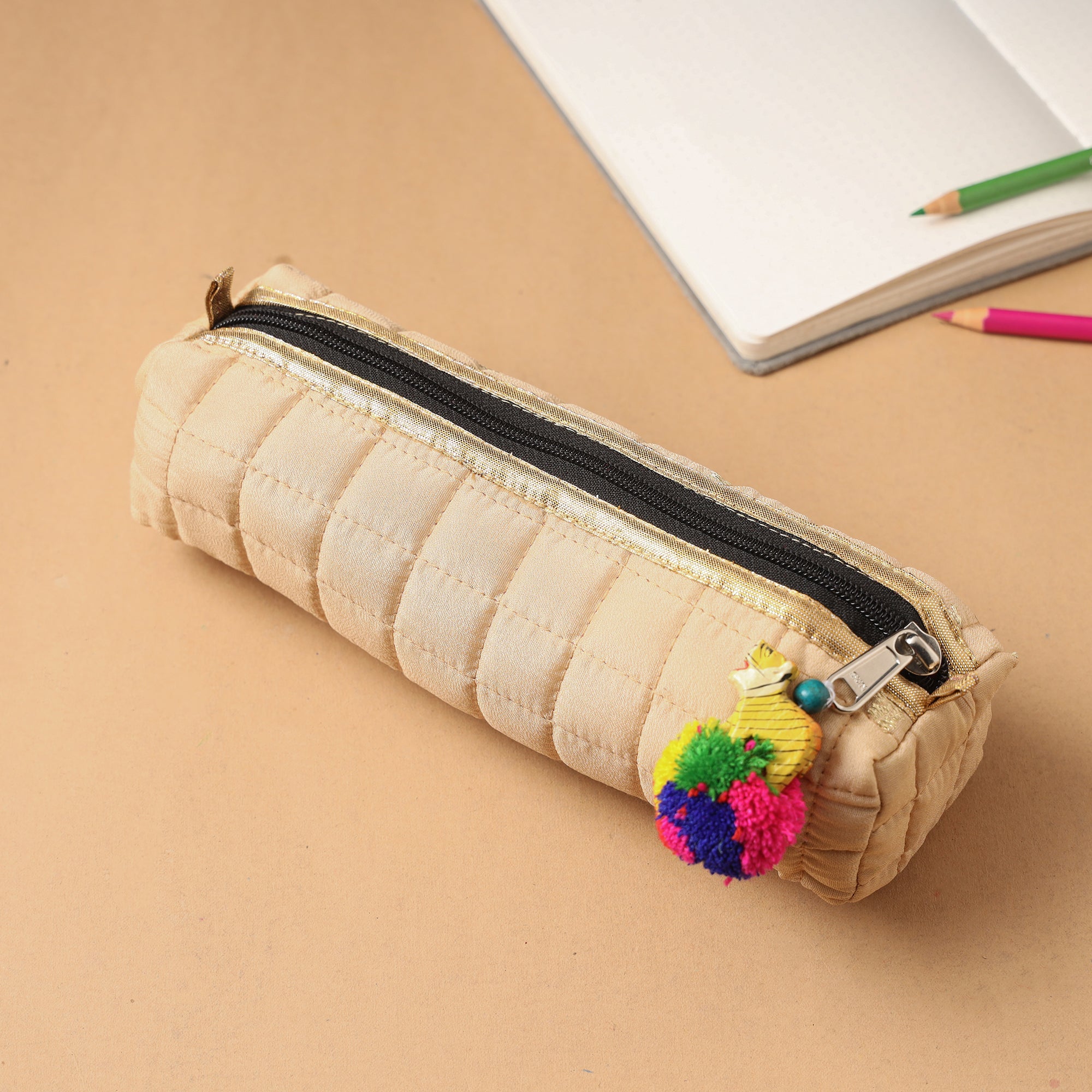 Experience the perfect blend of artistry and utility with our handcrafted quilted banarasi multipurpose/pencil pouch. This pouch is made from banarasi silk cotton fabric with quilted filling. Safely store your pencils, pens, and other essentials in style.