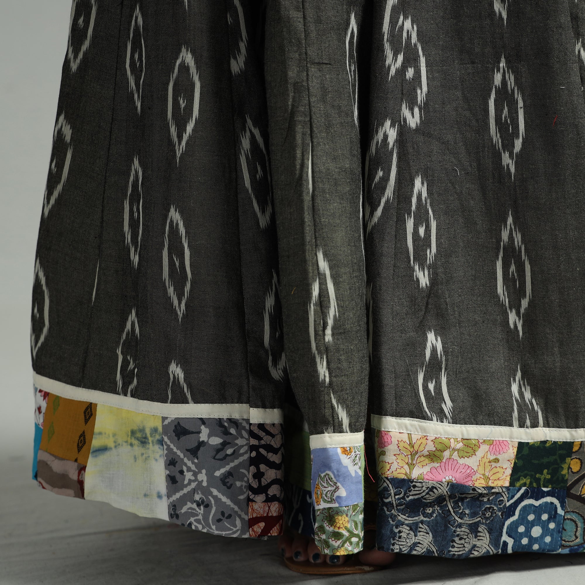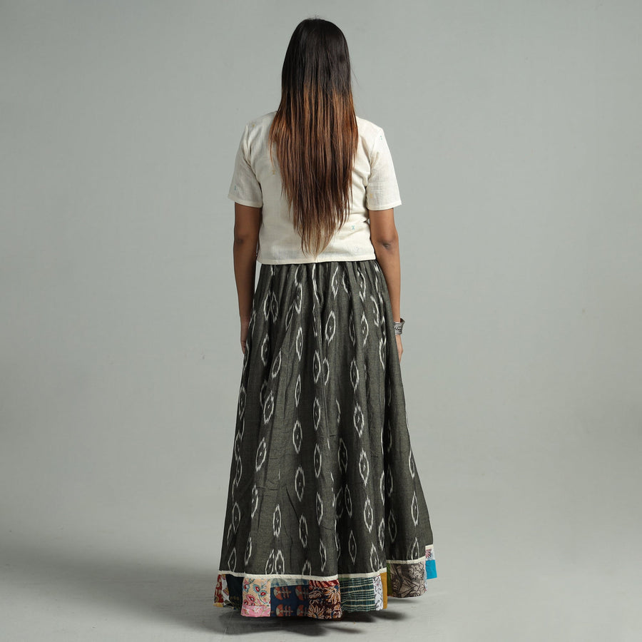 The grey pochampally ikat 24 kali cotton skirt with patchwork border features exquisite Ikat patterns. Crafted from pure cotton, This skirt boasts a waist tie-up closure, allowing for a customized and comfortable fit. The patchwork kali design adds a unique touch. Embrace elegance and tradition with this stunning piece.