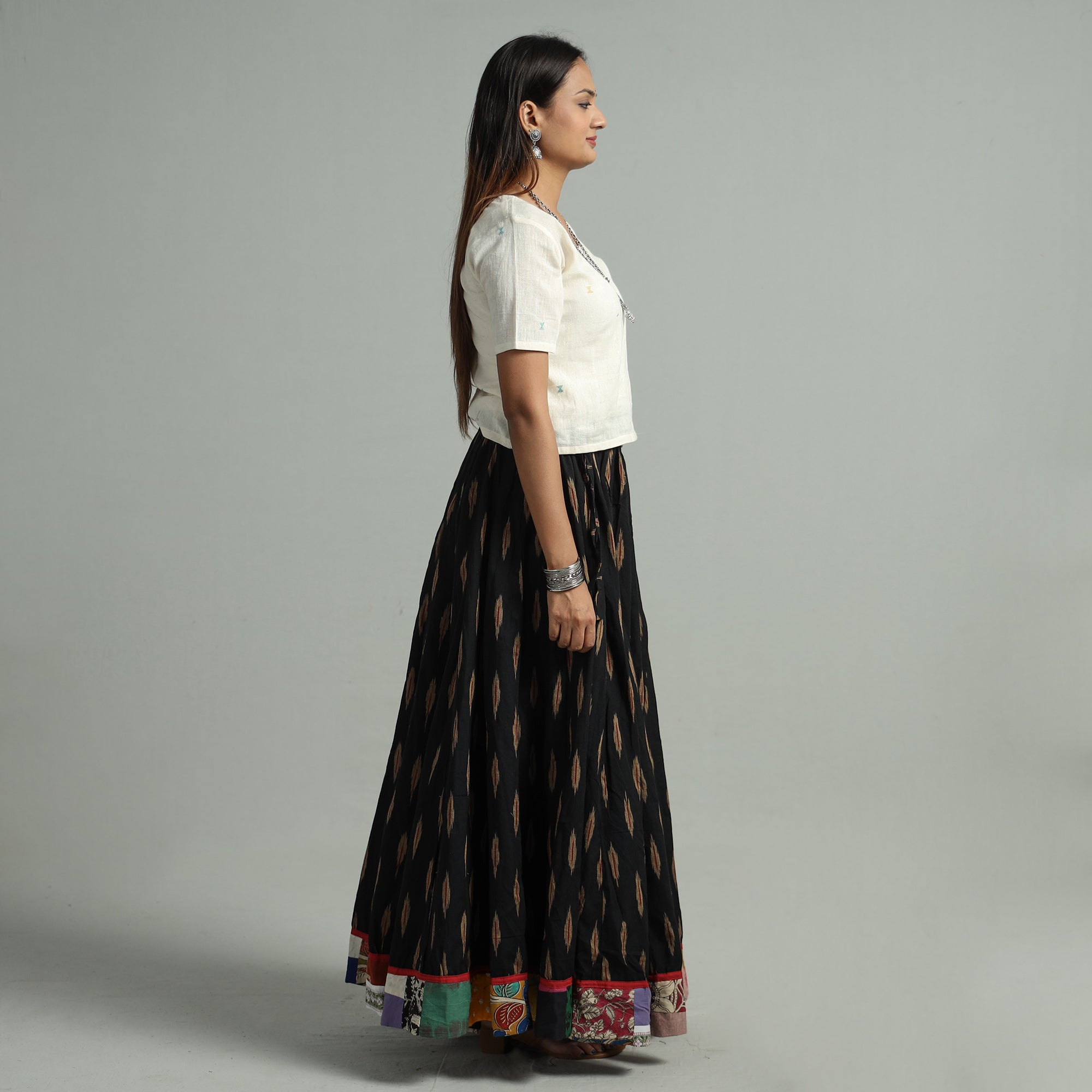 The black pochampally ikat 24 kali cotton skirt with patchwork border features exquisite Ikat patterns. Crafted from pure cotton, This skirt boasts a waist tie-up closure, allowing for a customized and comfortable fit. The patchwork kali design adds a unique touch. Embrace elegance and tradition with this stunning piece.