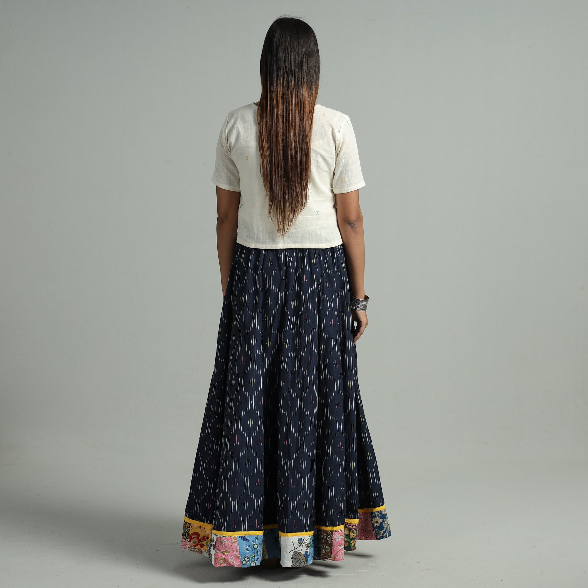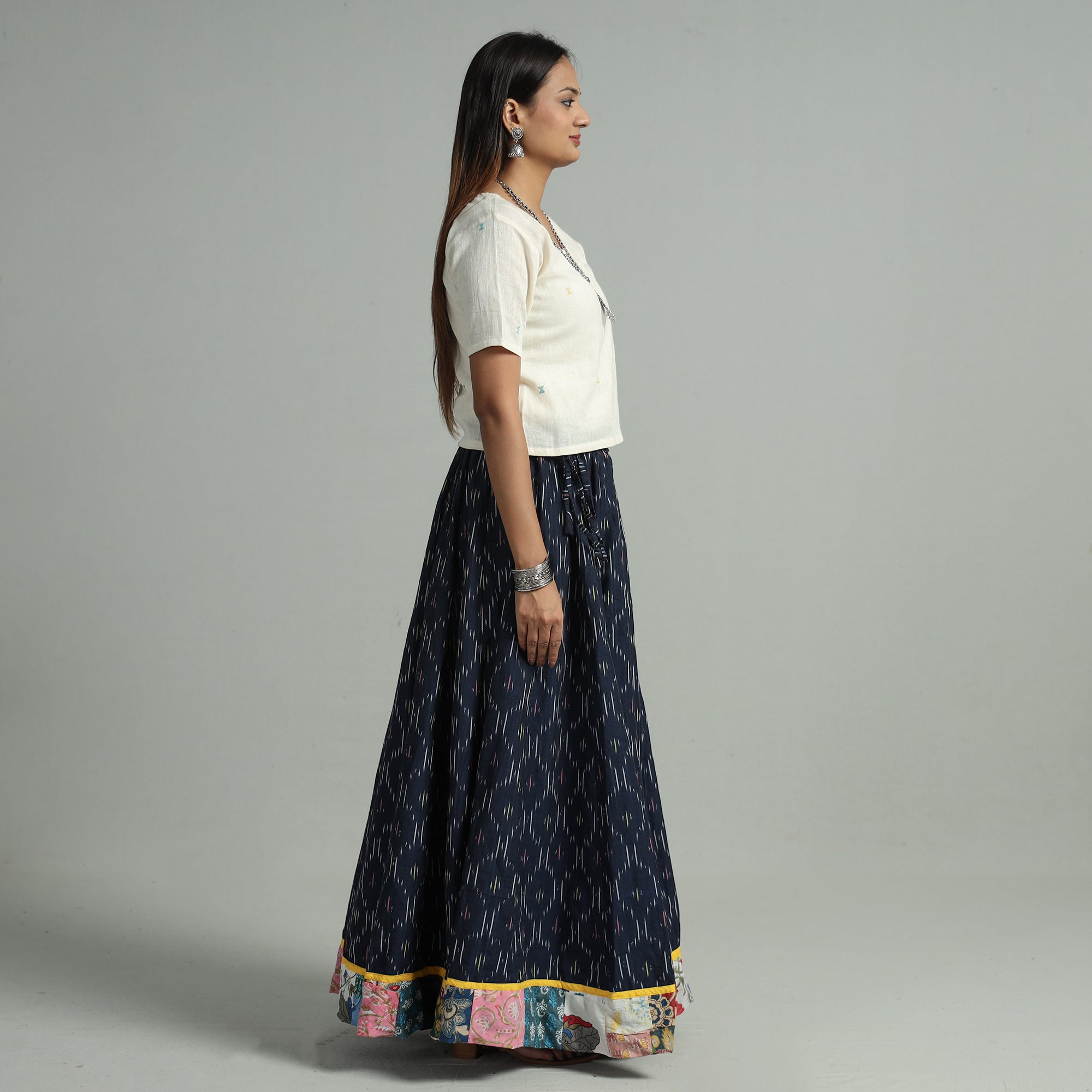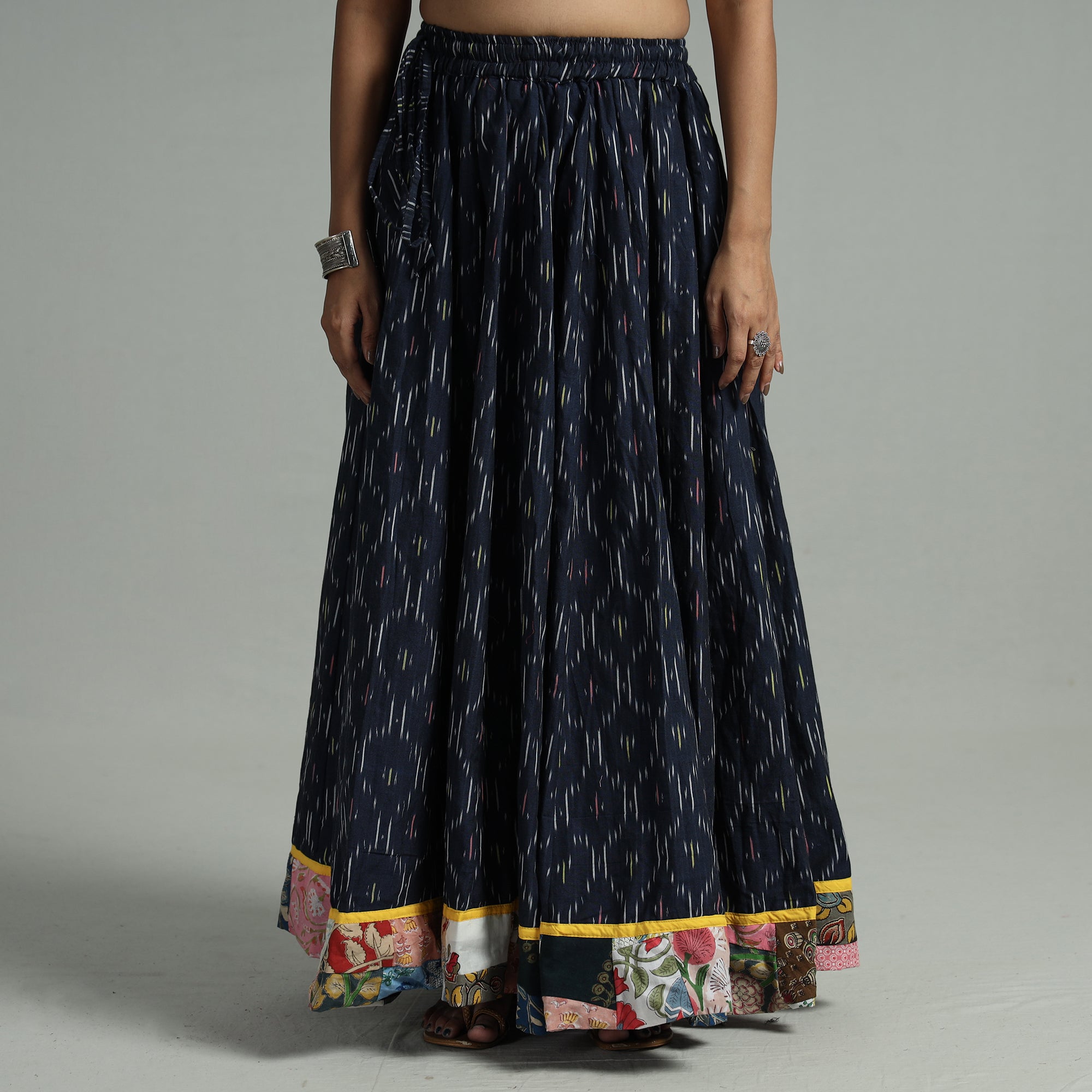 The blue pochampally ikat 24 kali cotton skirt with patchwork border features exquisite Ikat patterns. Crafted from pure cotton, This skirt boasts a waist tie-up closure, allowing for a customized and comfortable fit. The patchwork kali design adds a unique touch. Embrace elegance and tradition with this stunning piece.