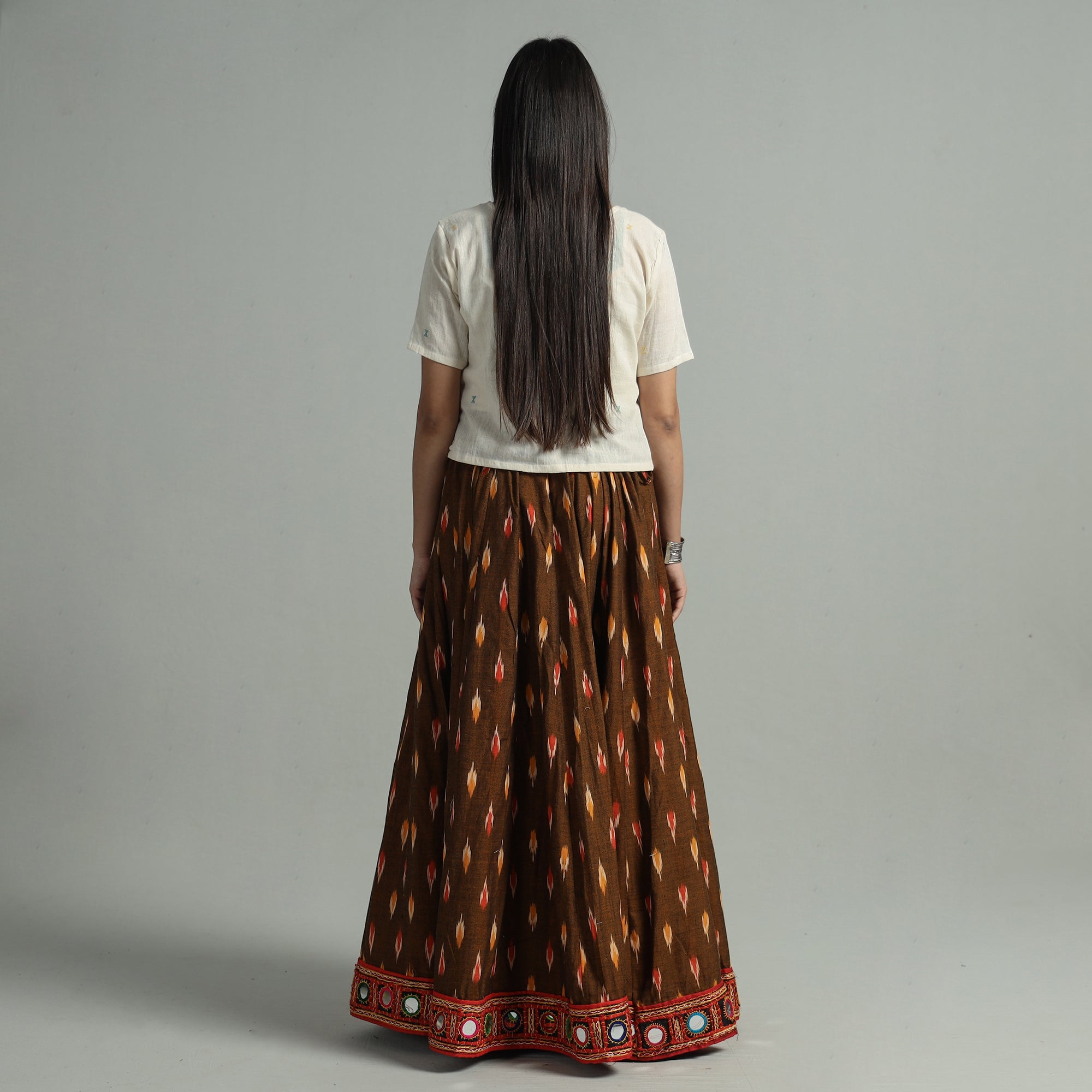 The brown pochampally ikat 24 kali cotton skirt with rajasthani embroidery Border features exquisite Ikat patterns. Crafted from pure cotton, This skirt boasts a waist tie-up closure, allowing for a customized and comfortable fit. The patchwork kali design adds a unique touch. Embrace elegance and tradition with this stunning piece.