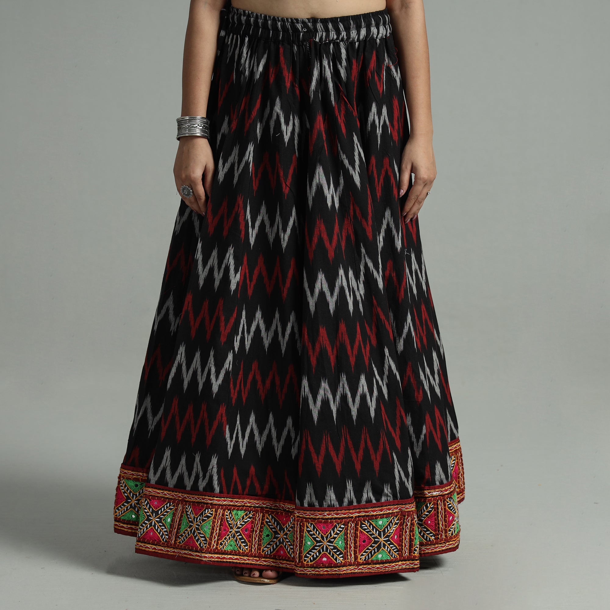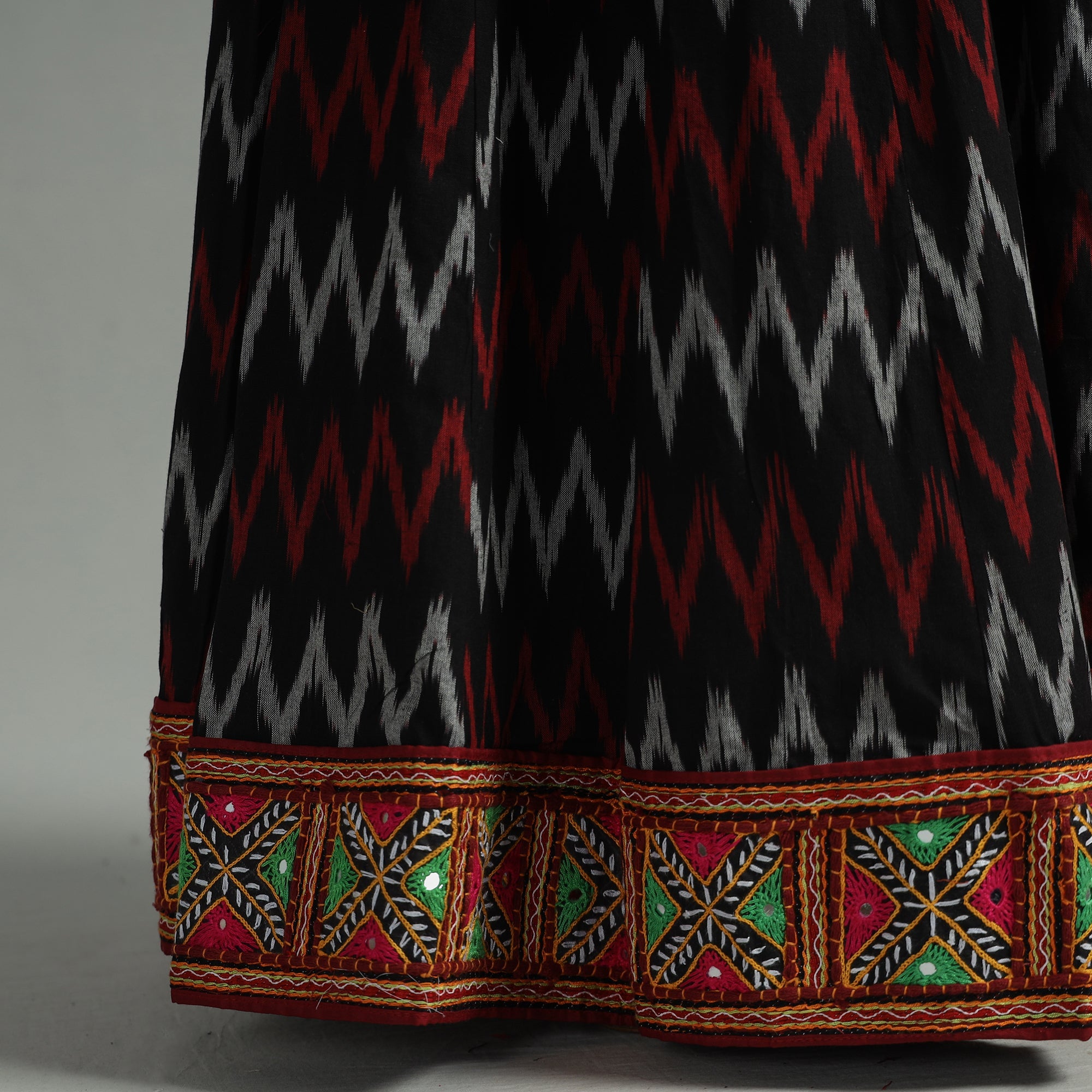 The black pochampally ikat 24 kali cotton skirt with rajasthani embroidery Border features exquisite Ikat patterns. Crafted from pure cotton, This skirt boasts a waist tie-up closure, allowing for a customized and comfortable fit. The patchwork kali design adds a unique touch. Embrace elegance and tradition with this stunning piece.